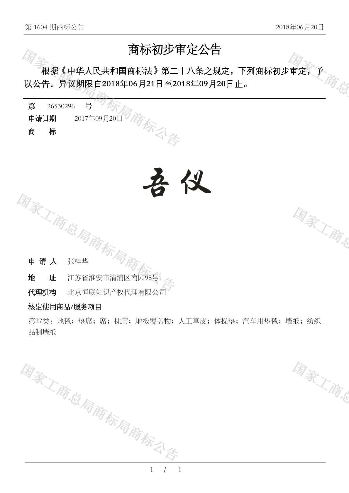 2701-地毯;2702-垫席;2702-席;2702-枕席;2703-人工草皮;2703-体操垫;2703-地板覆盖物;2703-汽车用垫毯;2704-墙纸;2704-纺织品制墙纸 - 1604