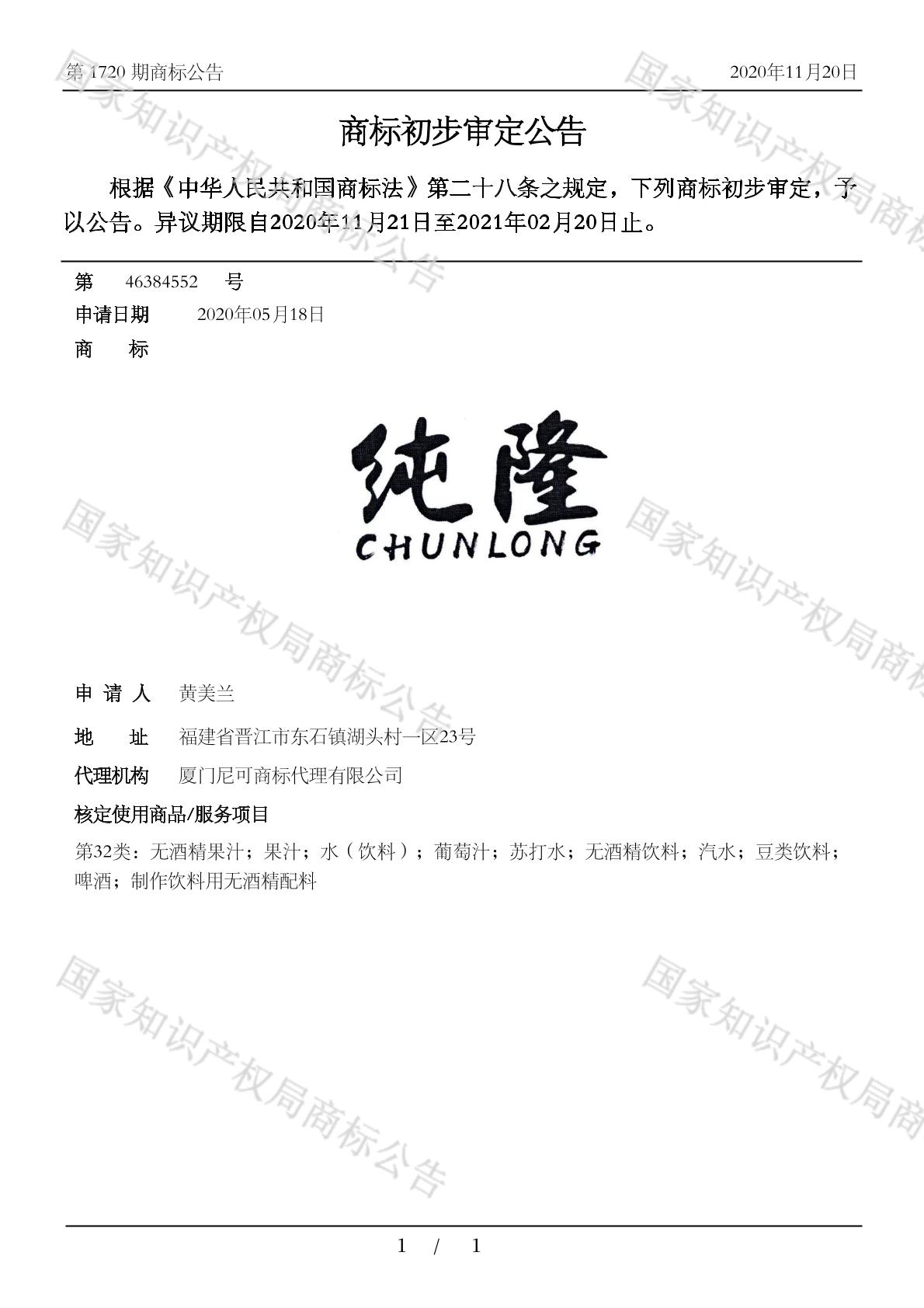 3201-啤酒;3202-无酒精果汁;3202-无酒精饮料;3202-果汁;3202-水(饮料);3202-汽水;3202-苏打水;3202-葡萄汁;3202-豆类饮料;3203-制作饮料用无酒精配料 - 1720