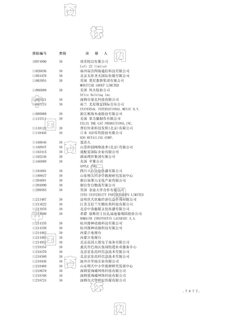 3801-新闻社;3802-信息传送;3802-寻呼(无线电、电话或其他电子通讯工具);3802-提供与全球计算机网络的电讯联接服务;3802-提供互联网聊天室;3802-提供全球计算机网络用户接入服务;3802-数字文件传送;3802-电子公告牌服务(通讯服务);3802-计算机终端通讯 - 1375
