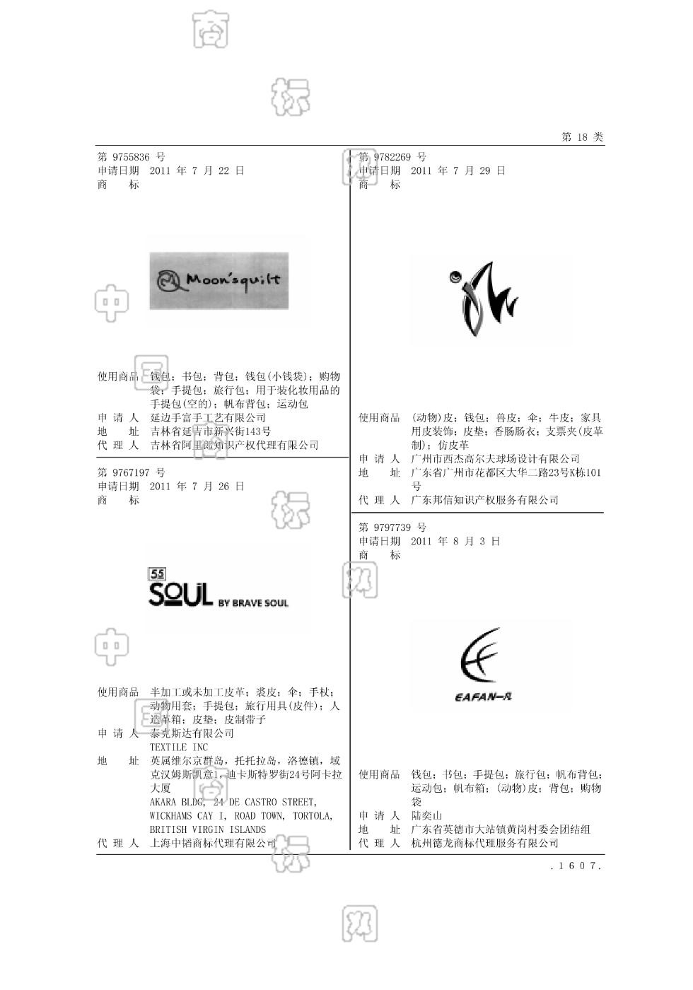 1801-半加工或未加工皮革;1802-人造革箱;1802-手提包;1802-旅行用具(皮件);1802-皮制带子;1802-皮垫;1803-裘皮;1804-伞;1805-手杖;1806-动物用套 - 1322