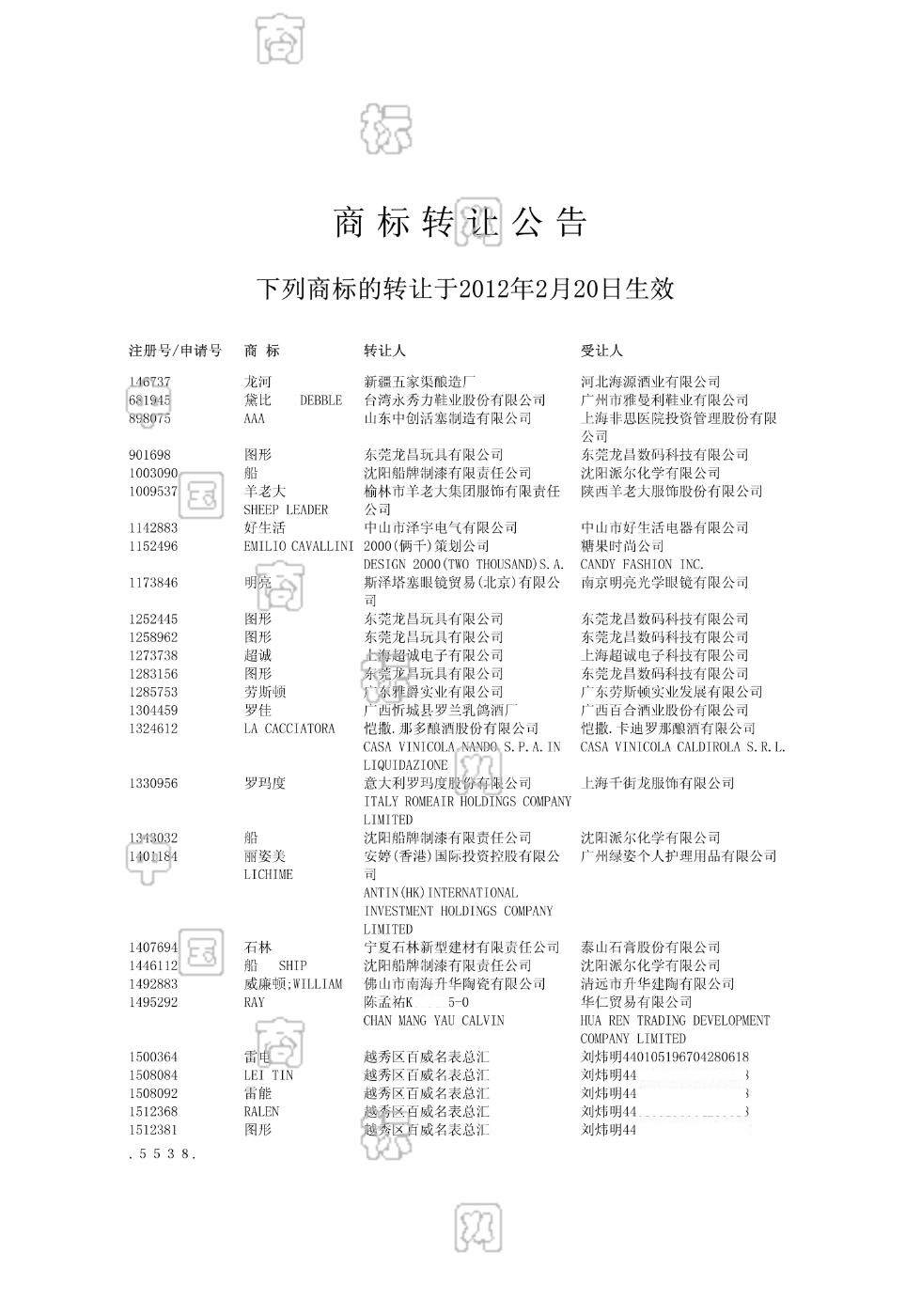 商标转让移转公告 2012-02-20 第1300期 查看公告