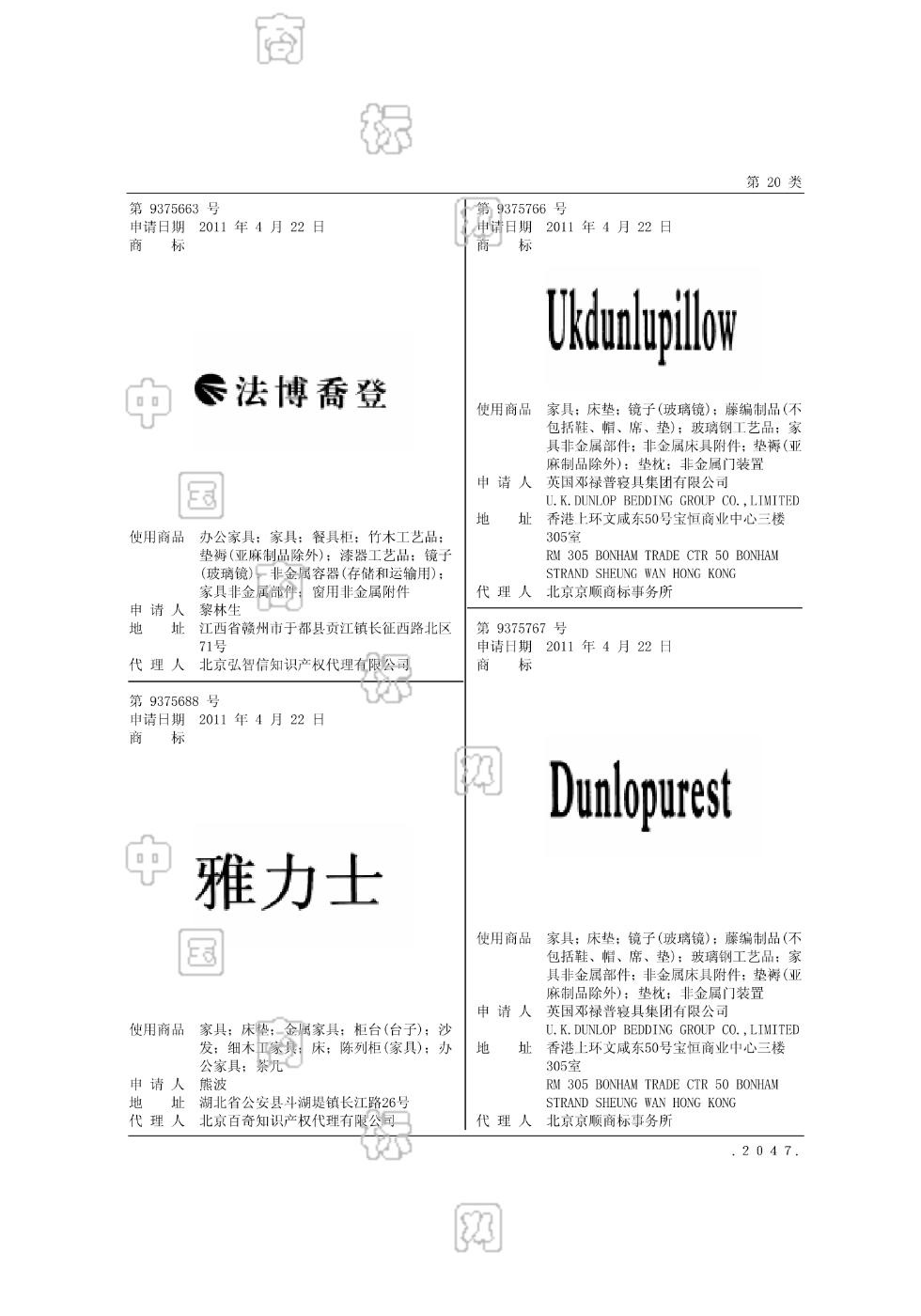 2001-家具;2001-床垫;2004-镜子(玻璃镜);2005-藤编制品(不包括鞋、帽、席、垫);2006-玻璃钢工艺品;2012-家具非金属 部件;2012-非金属床具附件;2013-垫枕;2013-垫褥(亚麻制品除外);2014-非金属门装置 - 1298