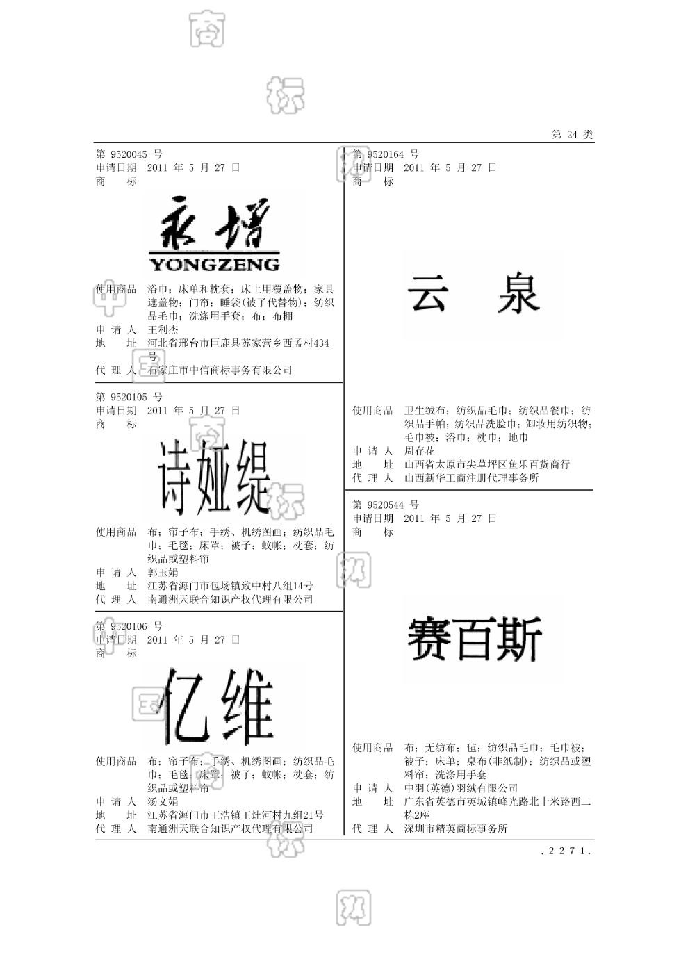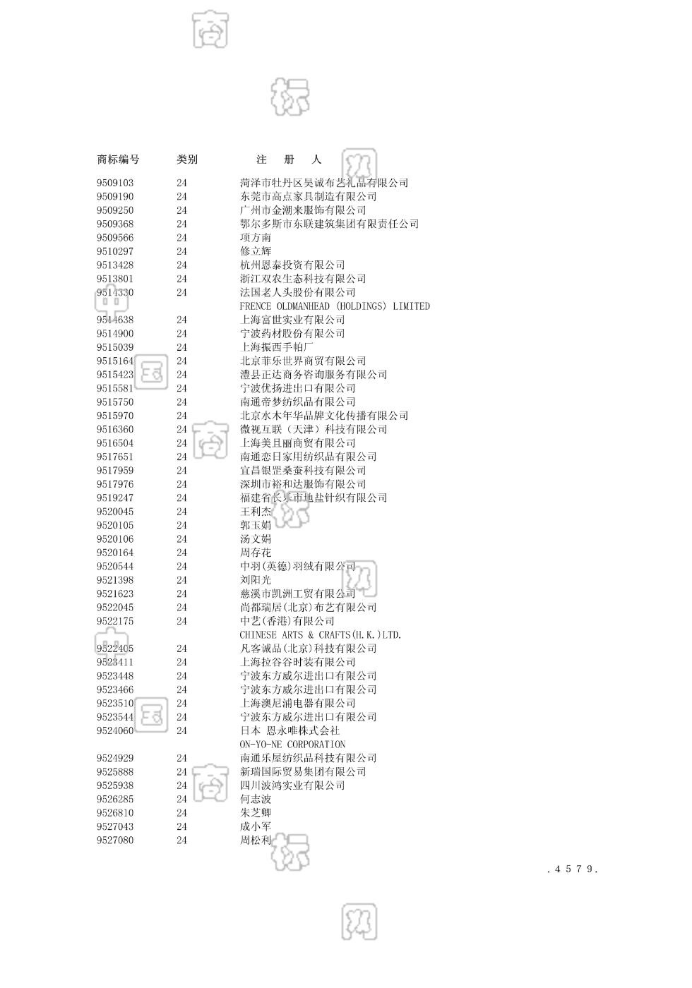 2401-布;2402-帘子布;2403-手绣、机绣图画;2405-纺织品毛巾;2406-床罩;2406-枕套;2406-毛毯;2406-蚊帐;2406-被子;2407-纺织品或塑料帘 - 1307