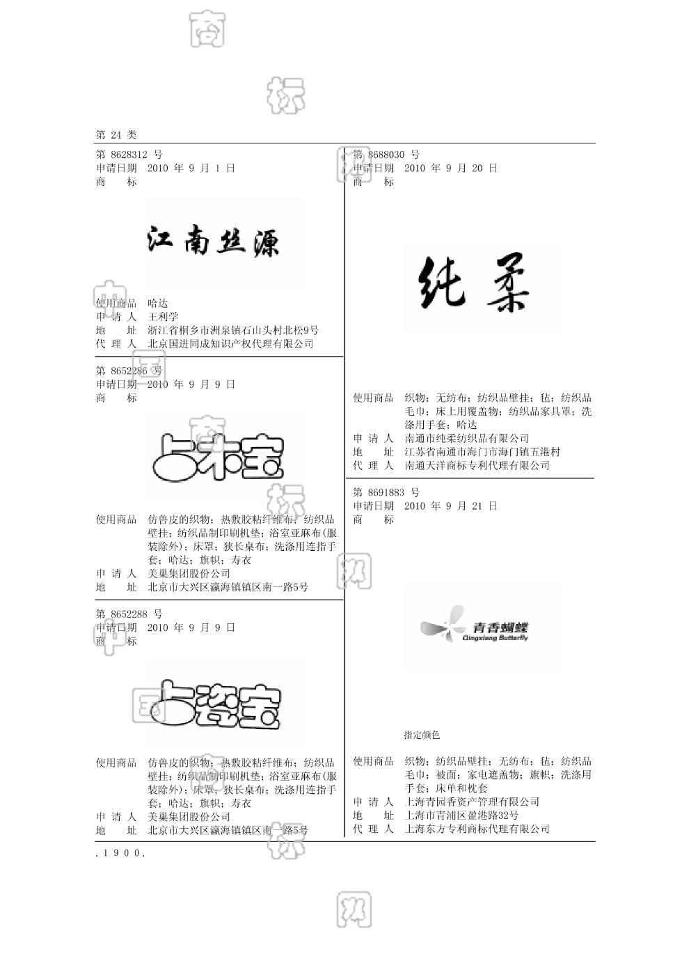 2401-织物;2402-无纺布;2403-纺织品壁挂;2404-毡;2405-纺织品毛巾;2406-床单和枕套;2406-被面;2407-家电遮盖物;2408-洗涤用手套;2410-旗帜 - 1276