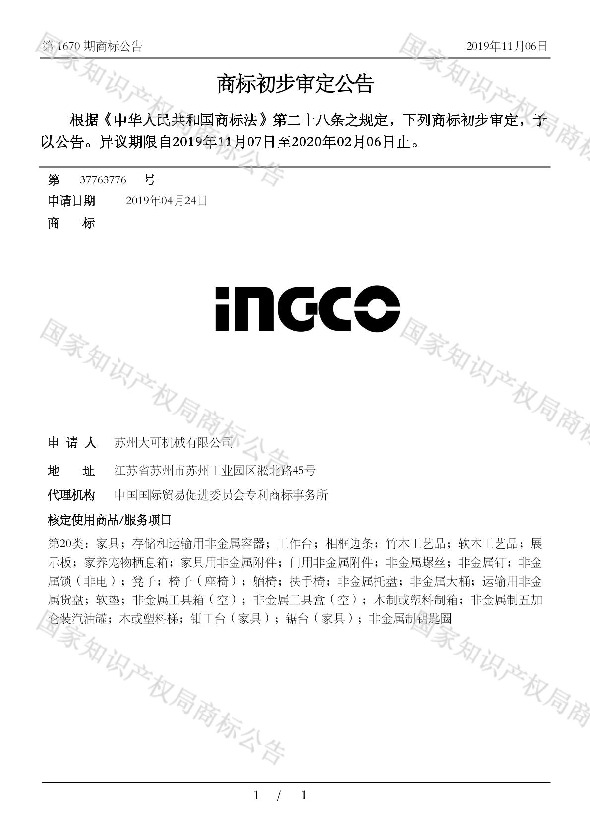 2001-凳子;2001-家具;2001-扶手椅;2001-椅子(座椅);2001-躺椅;2002-存储和运输用非金属容器;2002-木制或塑料制箱;2002-运输用非金属货盘;2002-非金属制五加仑装汽油罐;2002-非金属大桶;2002-非金属工具盒(空);2002-非金属工具箱(空);2002-非金属托盘;2003-工作台;2003-木或塑料梯;2003-钳工台(家具);2003-锯台(家具);2003-非金属制钥匙圈;2004-相框边条;2005-竹木工艺品;2006-软木工艺品;2007-展示板;2009-家养宠物栖息箱;2012-家具用非金属附件;2013-软垫;2014-门用非金属附件;2014-非金属螺丝;2014-非金属钉;2014-非金属锁(非电) - 1670