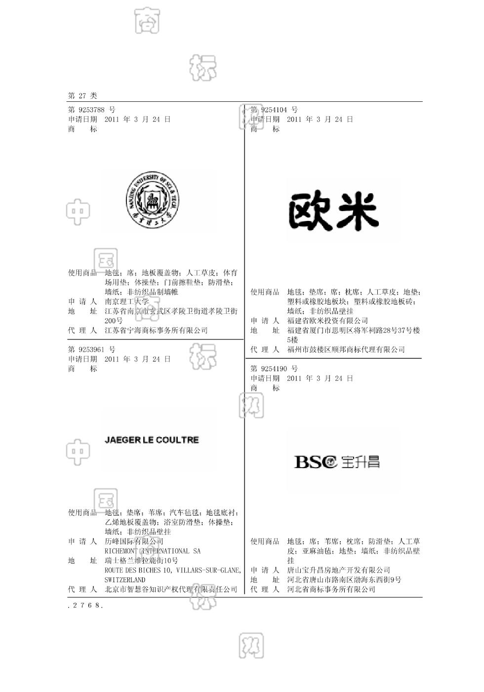 2701-地毯;2702-垫席;2702-席;2702-枕席;2703-人工草皮;2703-地垫;2703-塑料或橡胶地板块;2703-塑料或橡胶地板砖;2704-墙纸;2704-非纺织品壁挂 - 1293