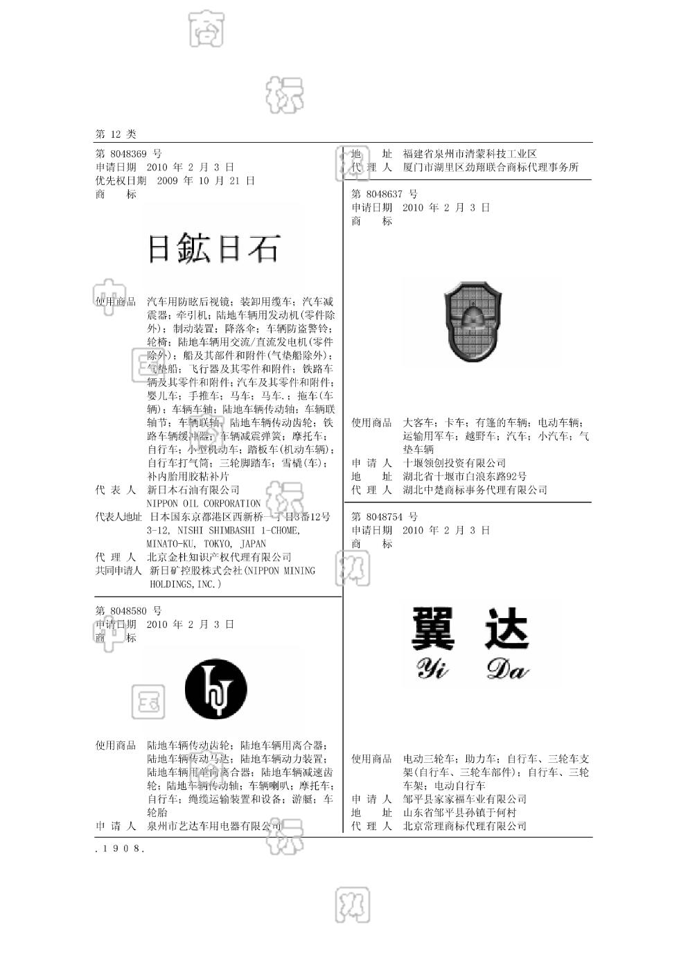 1201-牵引机;1201-铁路车辆及其零件和附件;1201-铁路车辆缓冲器;1202-制动装置;1202-小型机动车;1202-拖车(车辆);1202-汽车减震器;1202-汽车及其零件和附件;1202-汽车用防眩后视镜;1202-车辆减震弹簧;1202-车辆联轴;1202-车辆联轴节;1202-车辆车轴;1202-车辆防盗警铃;1202-陆地车辆传动轴;1202-陆地车辆传动齿轮;1202-陆地车辆用交流/直流发电机(零件除外);1202-陆地车辆用发动机(零件除外);1203-摩托车;1204-三轮脚踏车;1204-自行车;1204-自行车打气筒;1204-踏板车(机动车辆);1205-装卸用缆车;1206-婴儿车;1206-手推车;1206-轮椅;1207-雪橇(车);1208-补内胎用胶粘补片;1208-马车;1208-马车.;1209-降落伞;1209-飞行器及其零件和附件;1210-气垫船;1210-船及其部件和附件(气垫船除外) - 1247