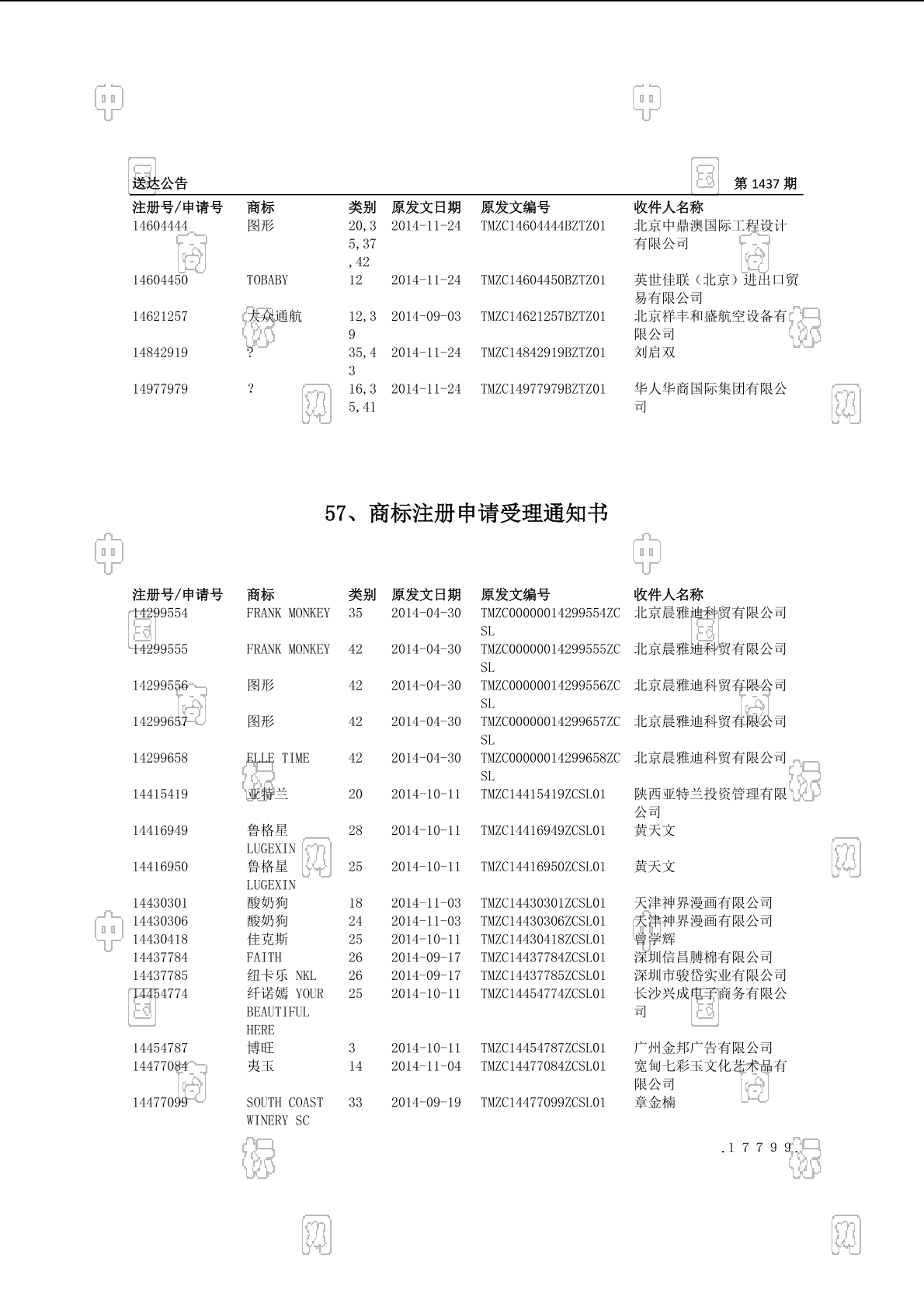2015-05-24 商标注册申请 | 排版送达公告(商标注册申请受理通知书)