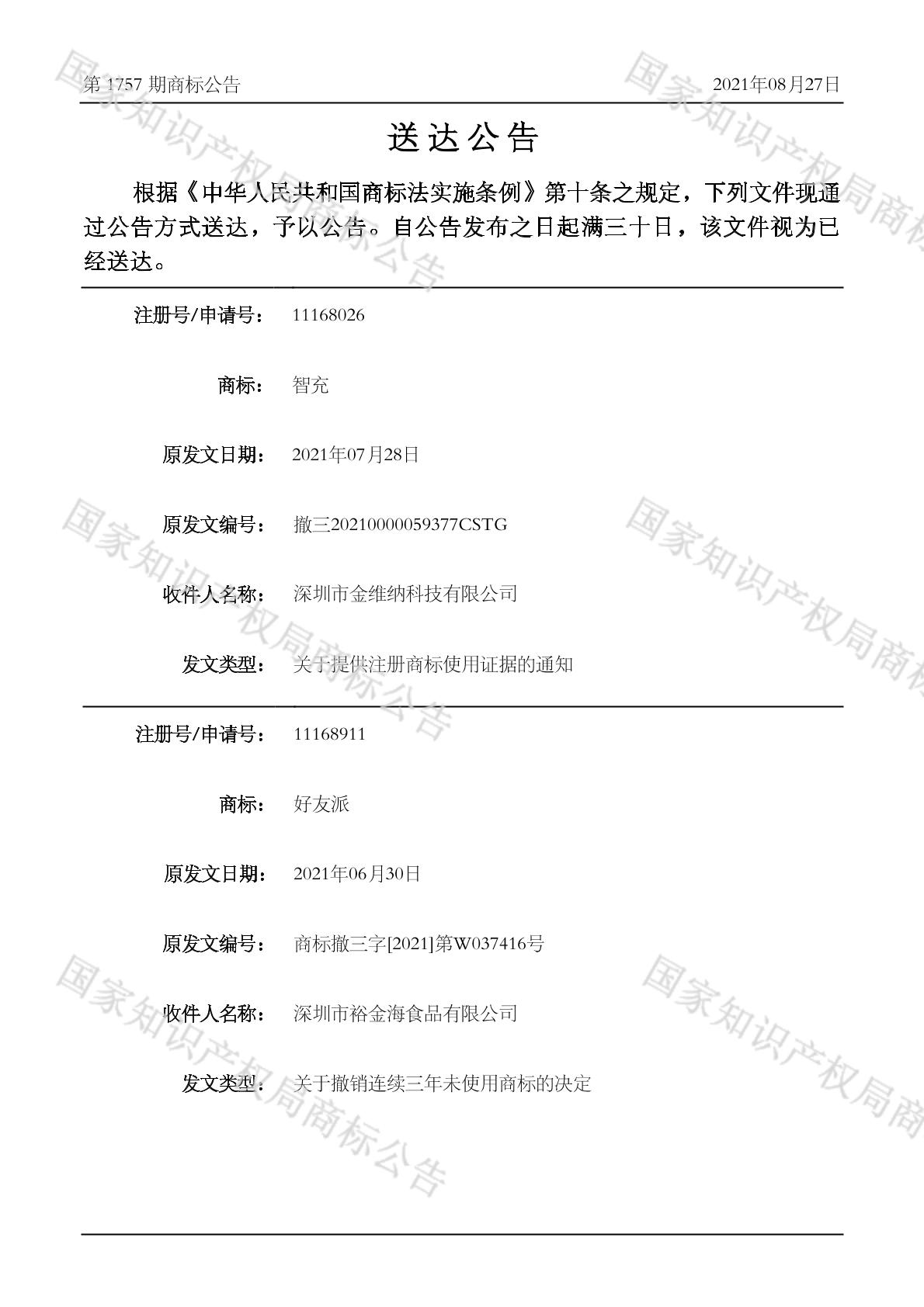 2021-08-27 撤销连续三年停止使用注册商标 | 排版送达公告(关于提供注册商标 使用证据的通知)