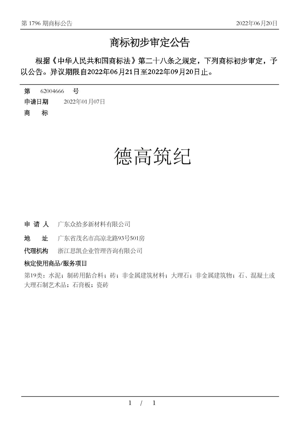 商标初步审定公告 2022-06-20 第1796期 查看公告