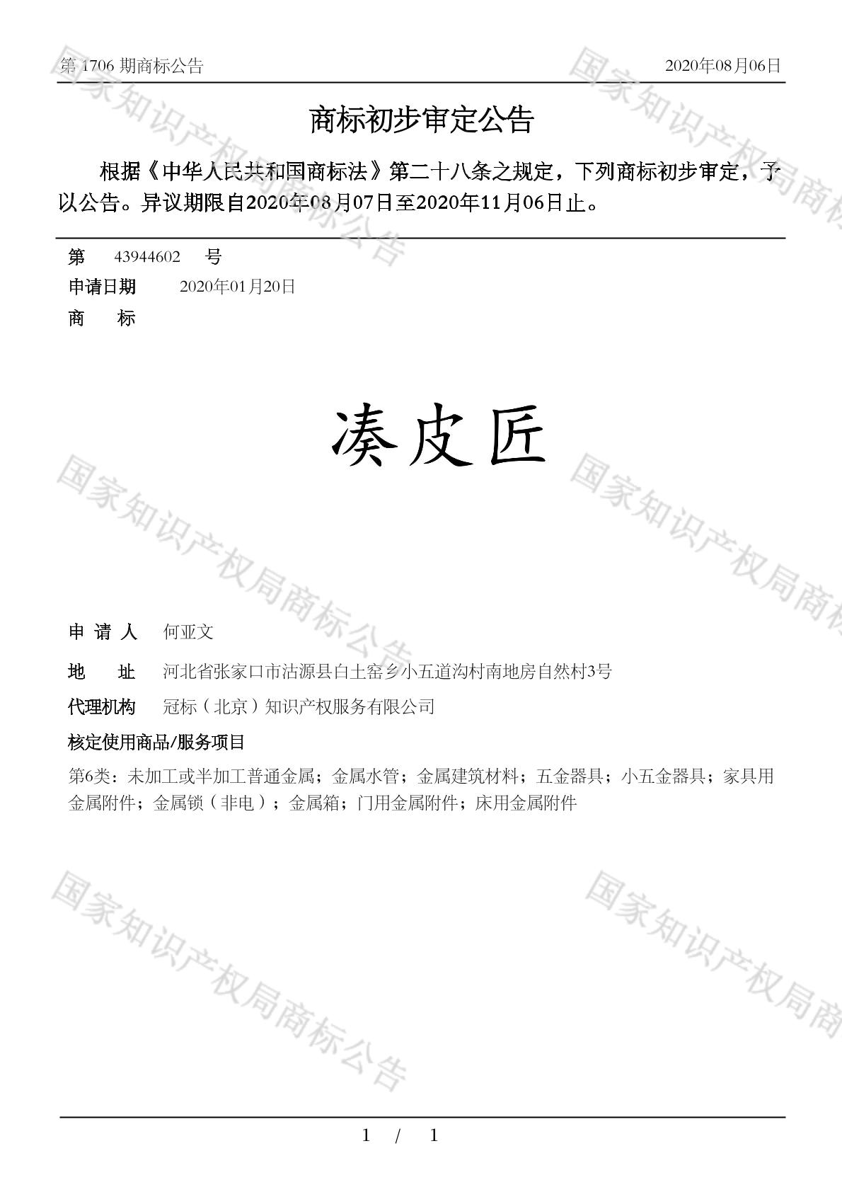 0601-未加工或半加工普通金属;0602-金属水管;0603-金属建筑材料;0607-五金器具;0607-小五金器具;0608-五金器具;0608-家具用金属附件;0608-小五金器具;0608-床用金属附件;0608-门用金属附件;0609-五金器具;0609-小五金器具;0610-金属锁(非电);0613-金属箱 - 1706
