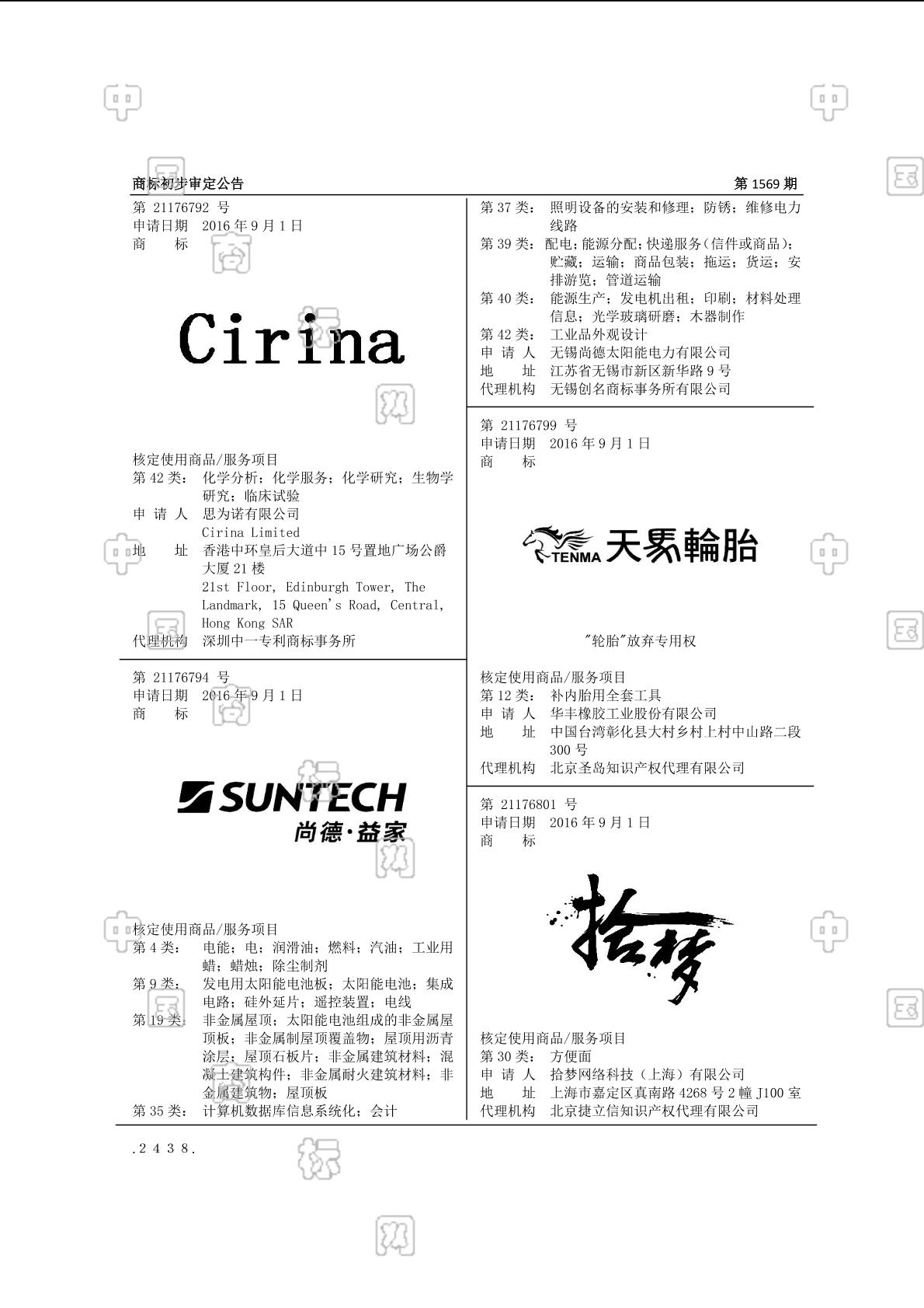 0717-电池机械;0739-风力发电设备;0744-电子工业设备;0745-光学冷加工设备;0748-交流发电机;0748-发电机;0748-发电机传动带;0748-发电机组;0748-电刷(发电机部件);0748-电流发生器 - 无锡尚德太阳能电力有限公司
