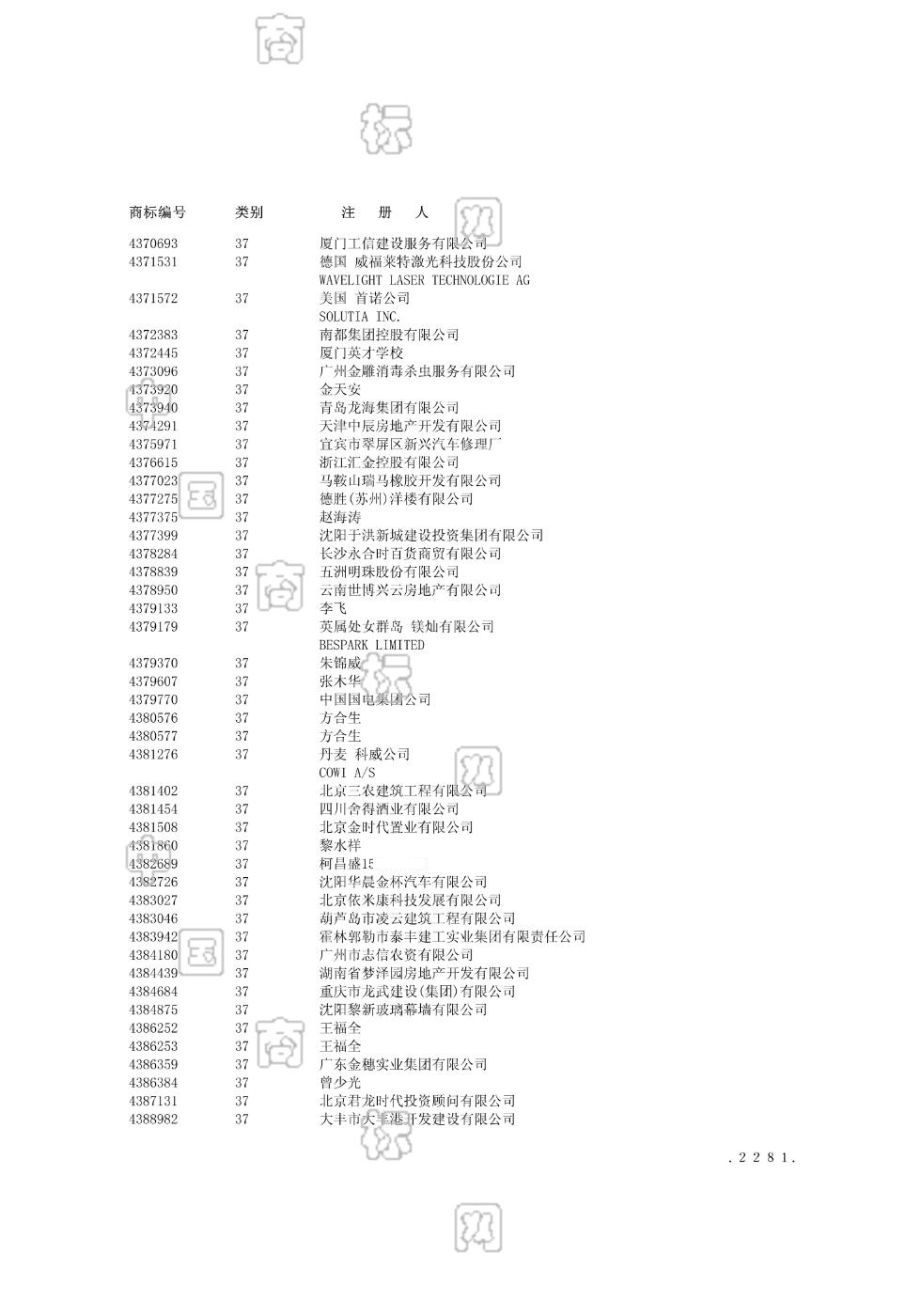 3701-建筑施工监督;3702-建筑设备出租;3703-采矿;3705-供暖设备的安装和修理;3706-电器设备的安装与修理;3707-车辆保养和修理;3713-防锈;3715-家具制造(修理);3716-干洗;3718-电梯安装和修理 - 1112