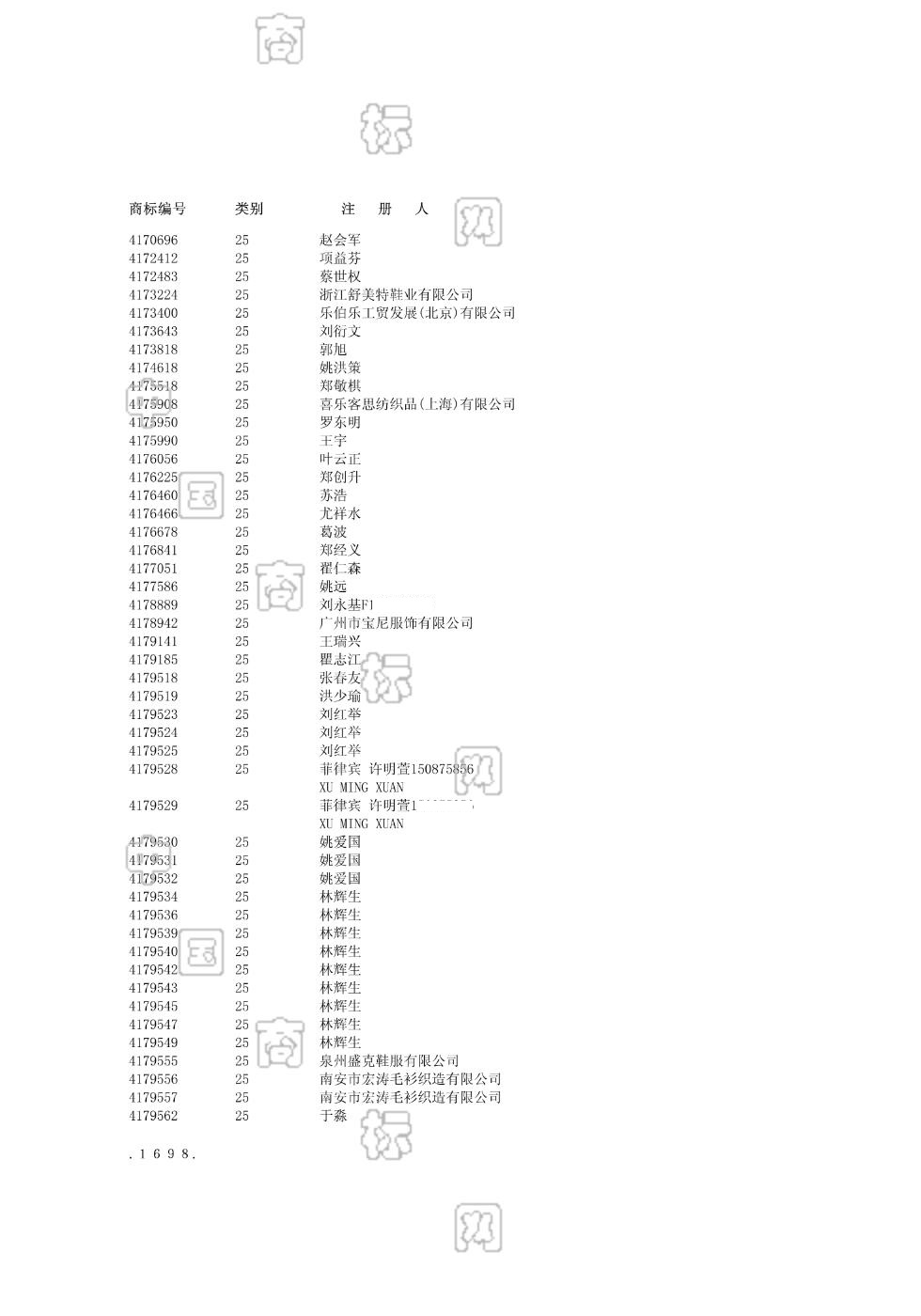 2501-服装;2502-婴儿全套衣;2503-游泳衣;2504-防水服;2506-体操鞋;2507-鞋;2508-帽;2509-袜;2511-领带;2513-婚纱 - 1097
