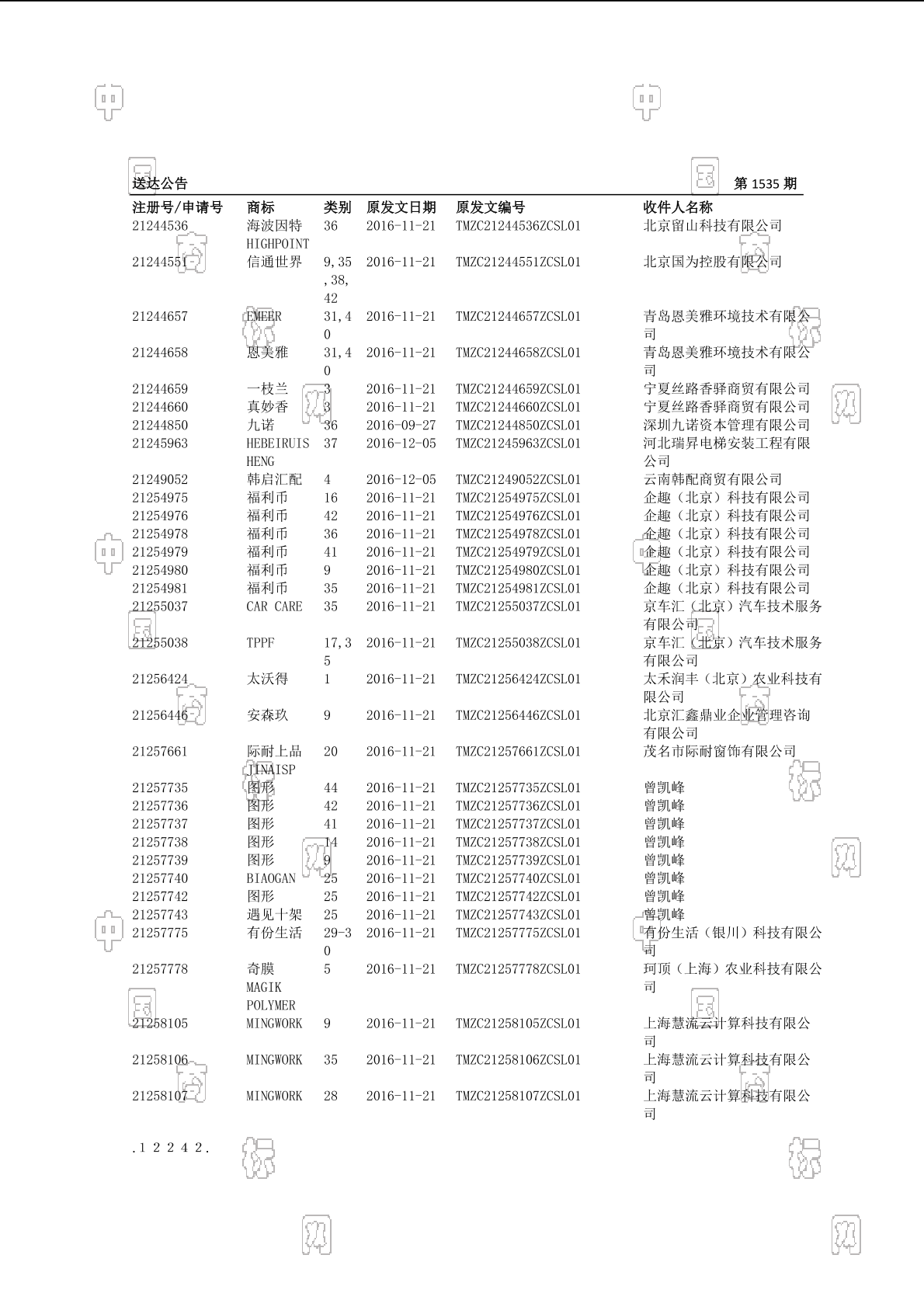 2017-01-15 商标注册申请 | 排版送达公告(商标注册申请受理通知书)