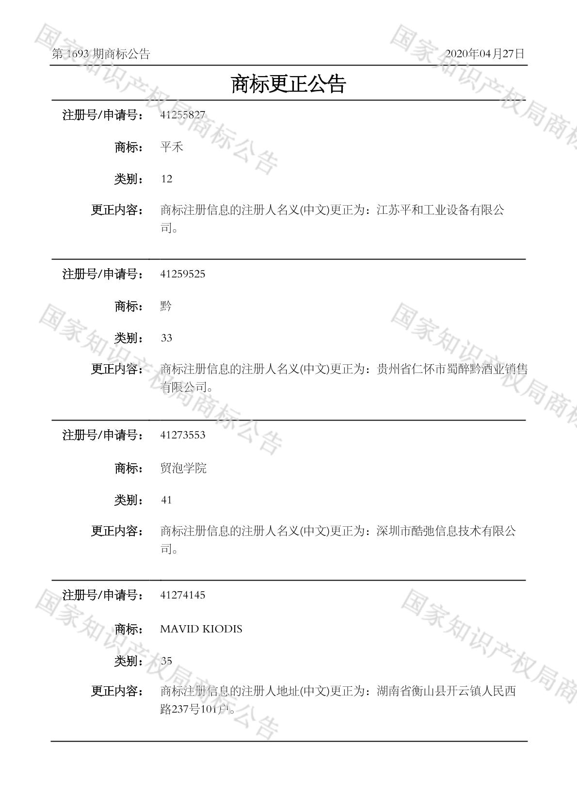 2020-04-22 更正商标申请/注册事项 | 核准通知发文
