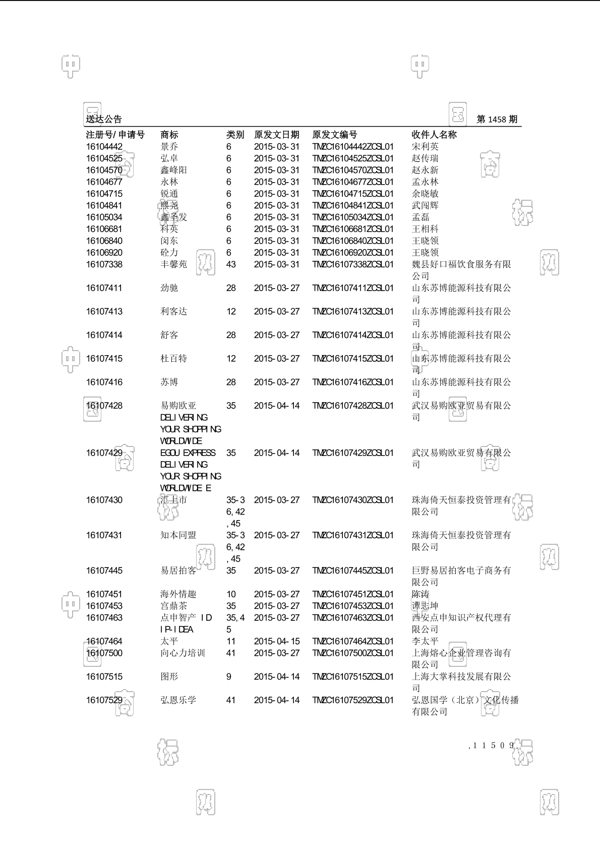 2015-06-08 商标注册申请 | 排版送达公告(商标注册申请受理通知书)