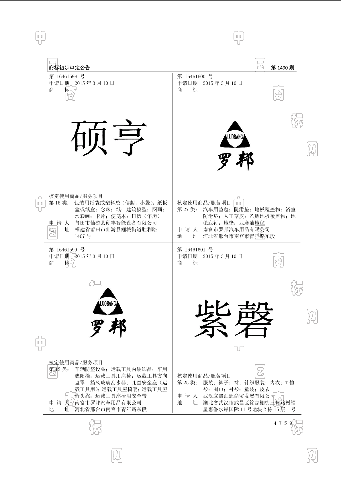1202-车用遮阳挡;1202-车辆防盗设备;1211-儿童安全座(运载工具用);1211-挡风玻璃刮水器;1211-运载工具内装饰品;1211-运载工具座椅头靠;1211-运载工具座椅套;1211-运载工具座椅用安全带;1211-运载工具方向盘罩;1211-运载工具用座椅 - 1490