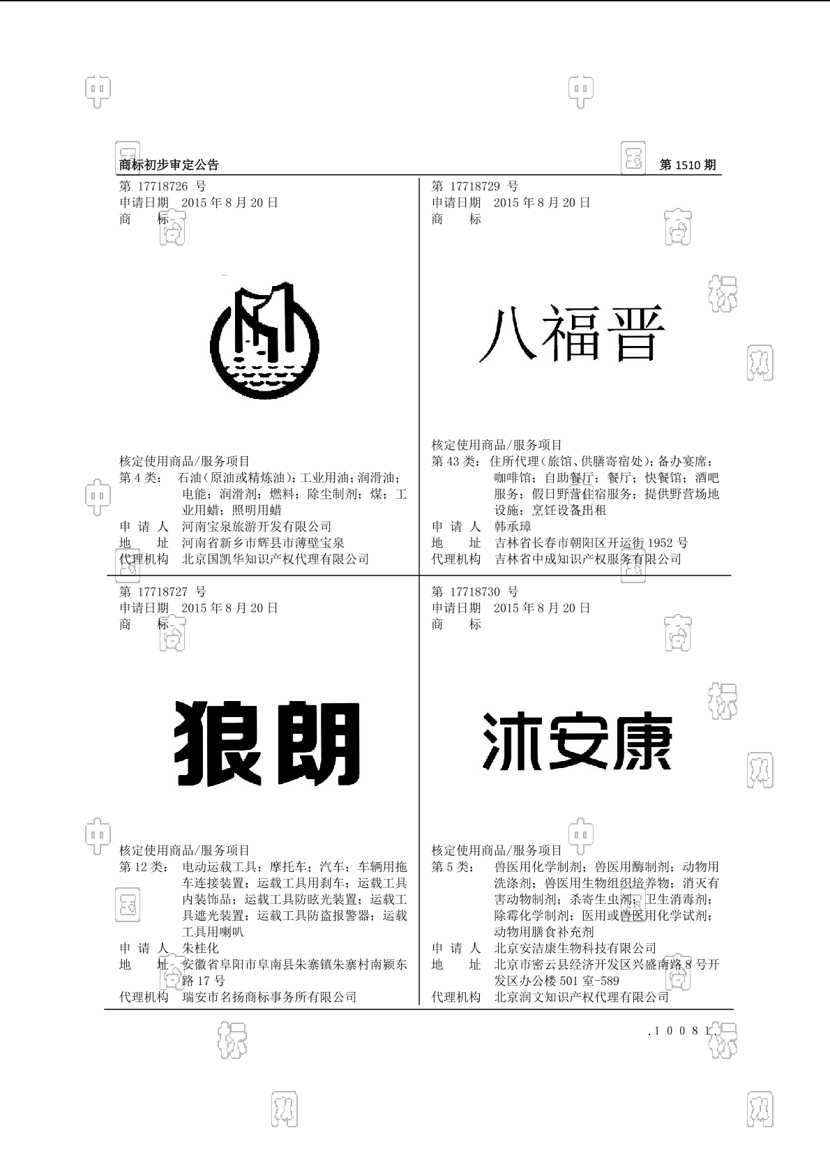1201-电动运载工具;1202-摩托车;1202-汽车;1202-电动运载工具;1202-车辆用拖车连接装置;1204-电动运载工具;1205-电动运载工具;1210-电动运载工具;1211-运载工具内装饰品;1211-运载工具用刹车;1211-运载工具用喇叭;1211-运载工具遮光装置;1211-运载工具防盗报警器;1211-运载工具防眩光装置 - 1510