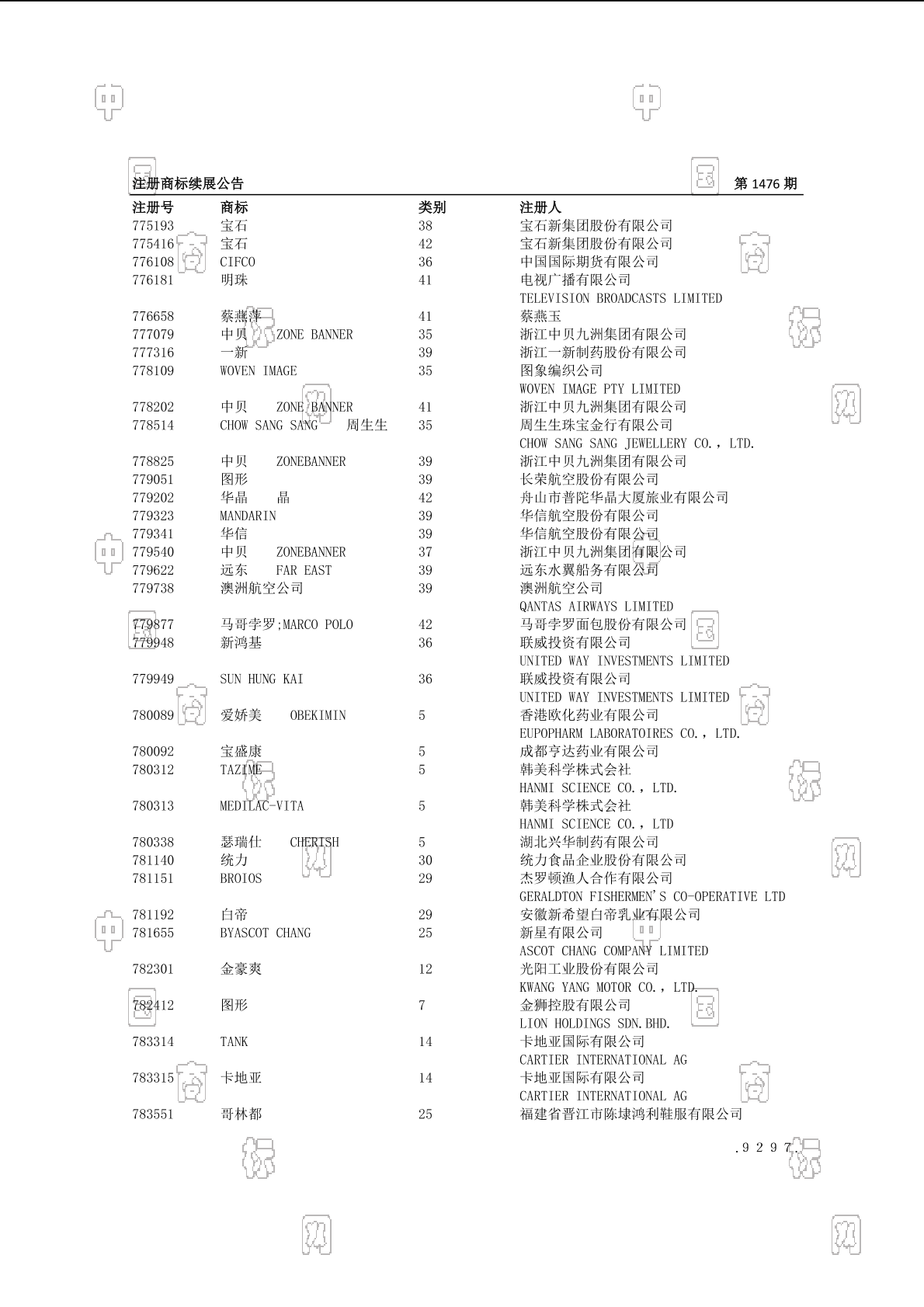注册商标续展公告 2015-10-20 第1476期 查看公告