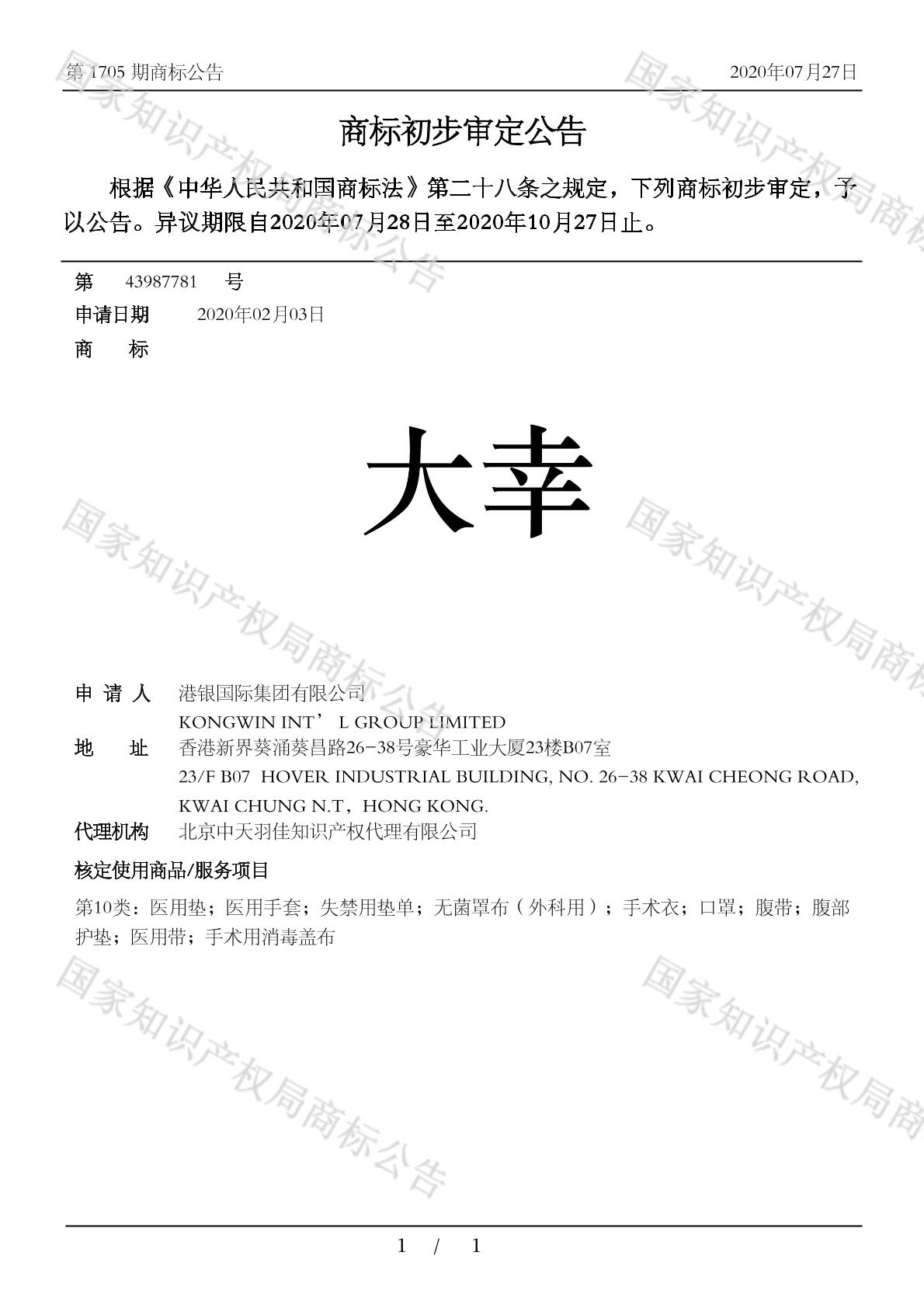 1004-医用垫;1004-医用带;1004-医用手套;1004-口罩;1004-失禁用垫单;1004-手术用消毒盖布;1004-手术衣;1004-无菌罩布(外科用);1004-腹部护垫;1008-腹带 - 1705