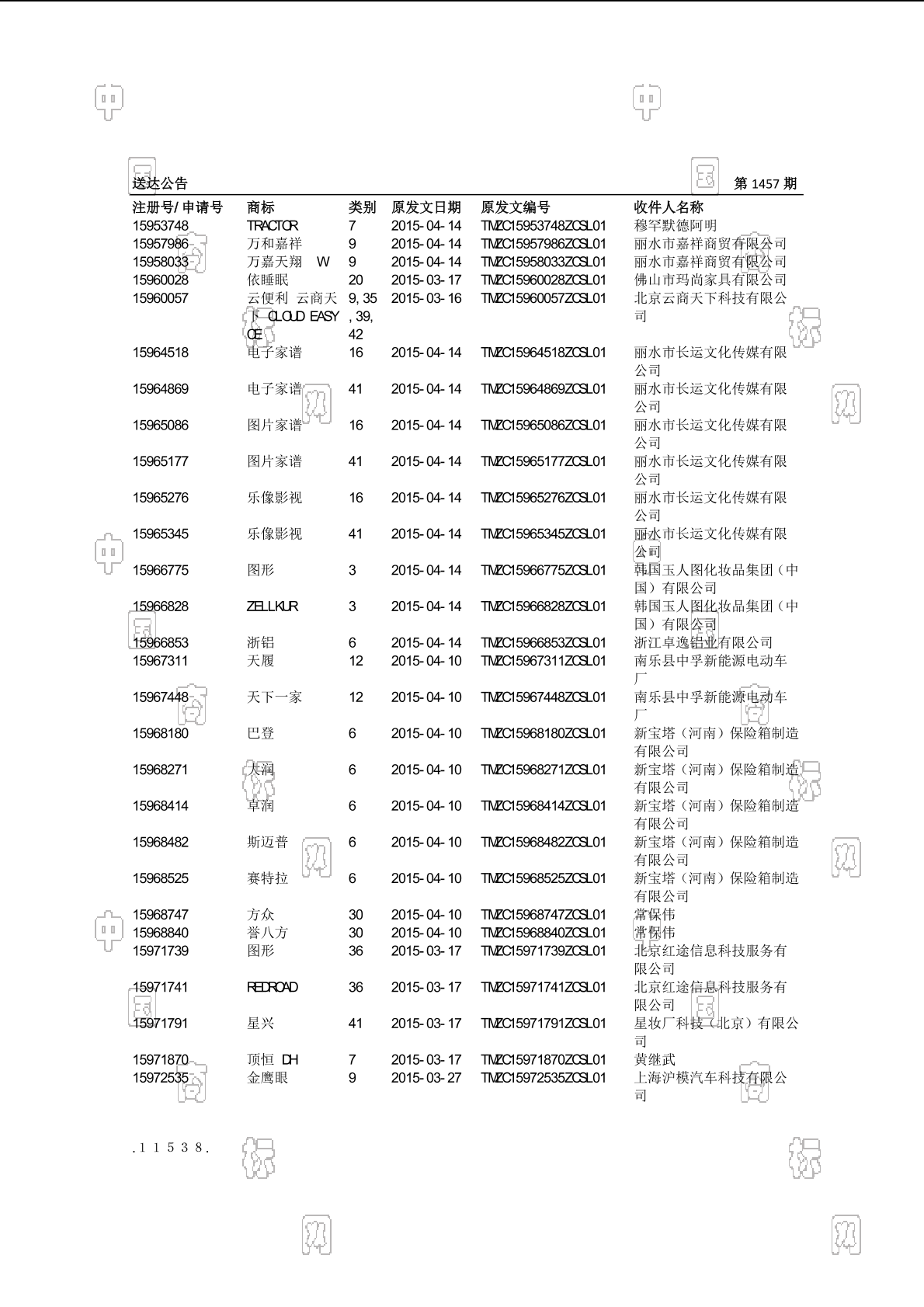 2015-06-01 商标注册申请 | 排版送达公告(商标注册申请受理通知书)