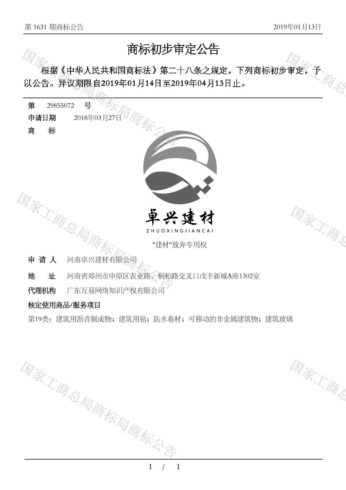 1901-木地板;1902-筑路或铺路材料;1906-瓷砖;1908-建筑用毡;1908-建筑用沥青制成物;1908-防水卷材;1909-非金属门;1910-可移动的非金属建筑物;1911-建筑玻璃;1912-涂层(建筑材料) - 1631
