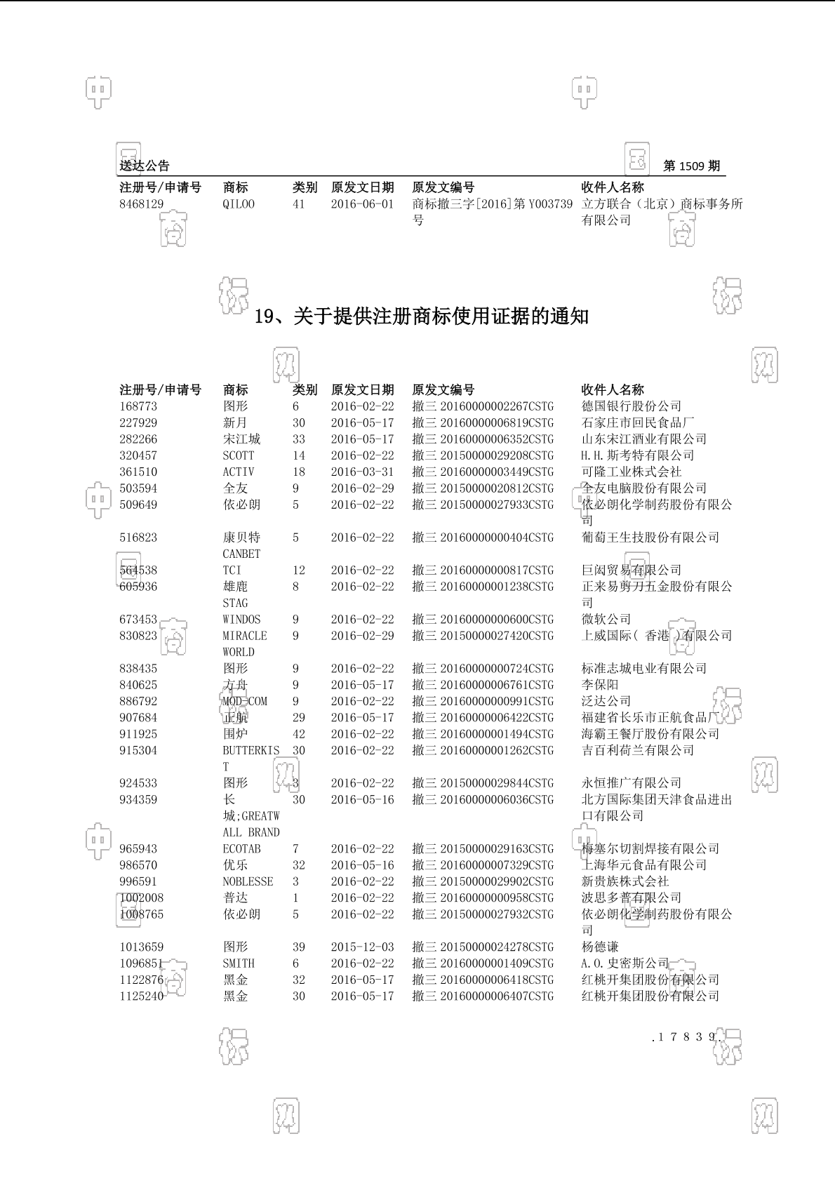 2016-10-27 撤销连续三年停止使用注册商标 | 撤销商标通知发文