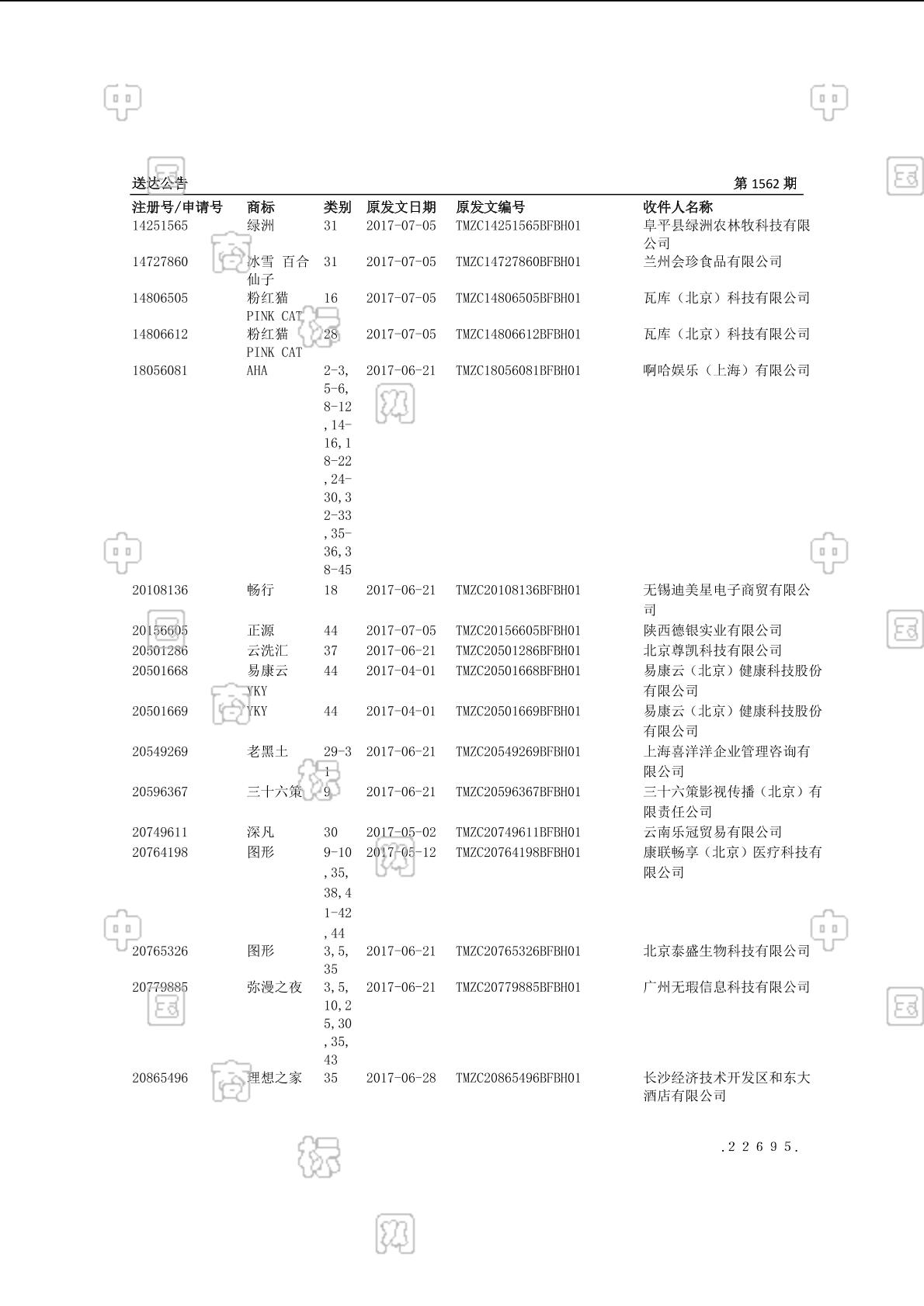 2017-07-14 商标注册申请 | 有退信(商标部分驳回通知书)