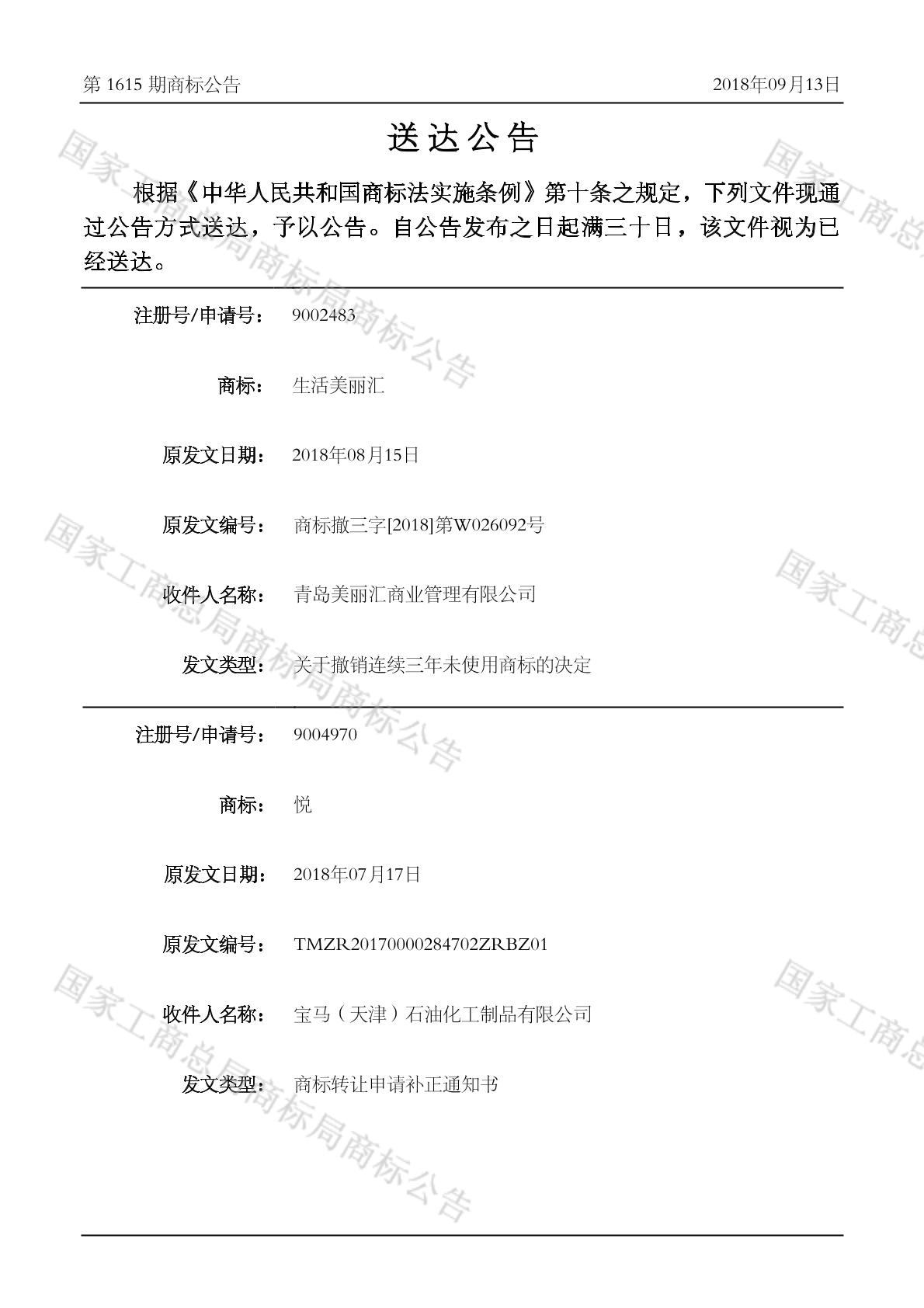 2018-09-13 商标转让 | 排版送达公告(商标转让申请补正通知书)
