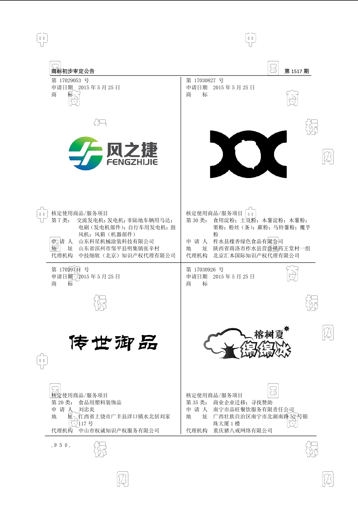 0701-农业机械;0706-纺织工业用机器;0736-铸造机械;0748-交流发电机;0748-发电机;0748-电刷(发电机部件);0748-自行车用发电机;0748-非陆地车辆用马达;0749-风箱(机器部件);0749-鼓风机 - 1517