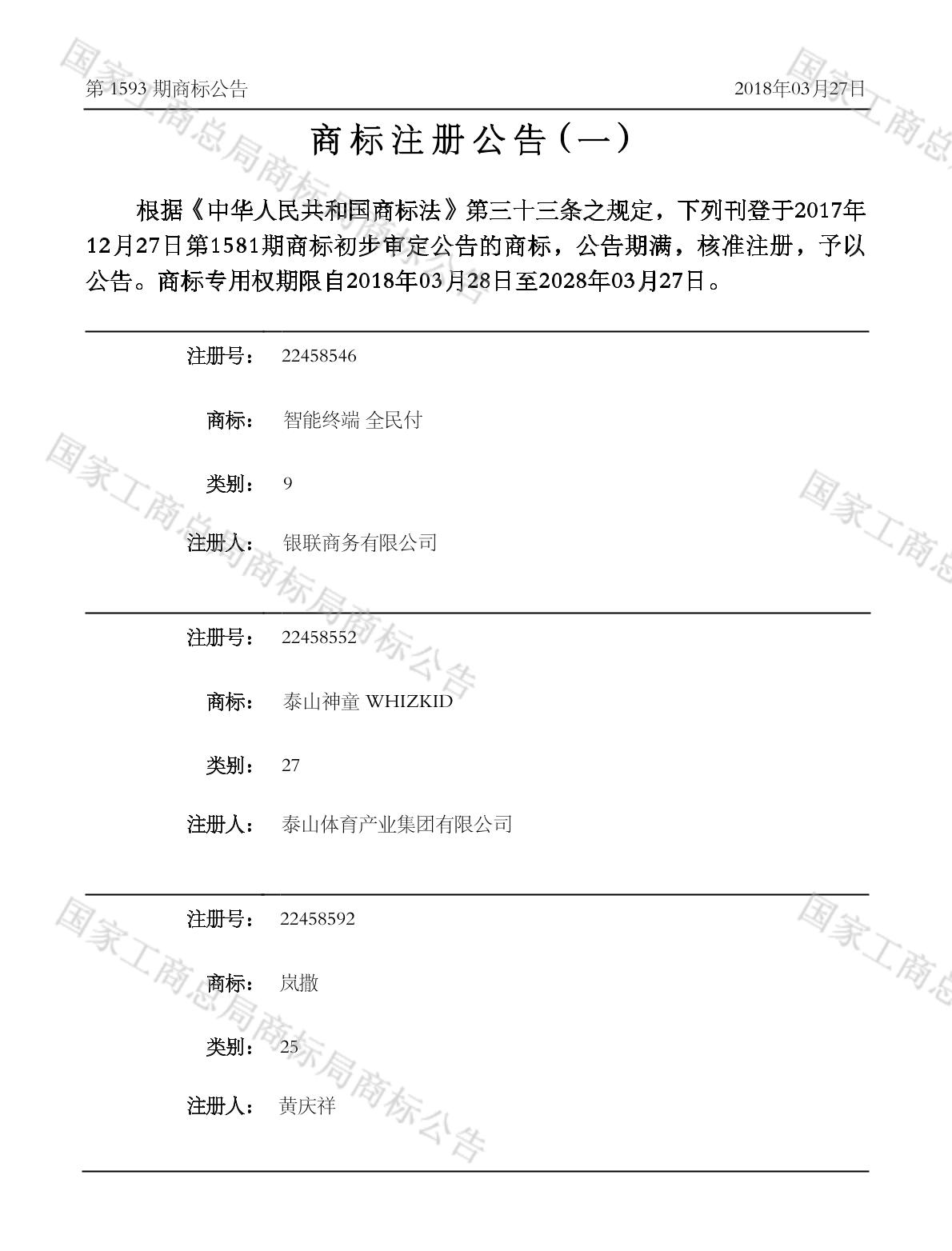 商标注册公告(一) 2018-03-27 第1593期 查看公告