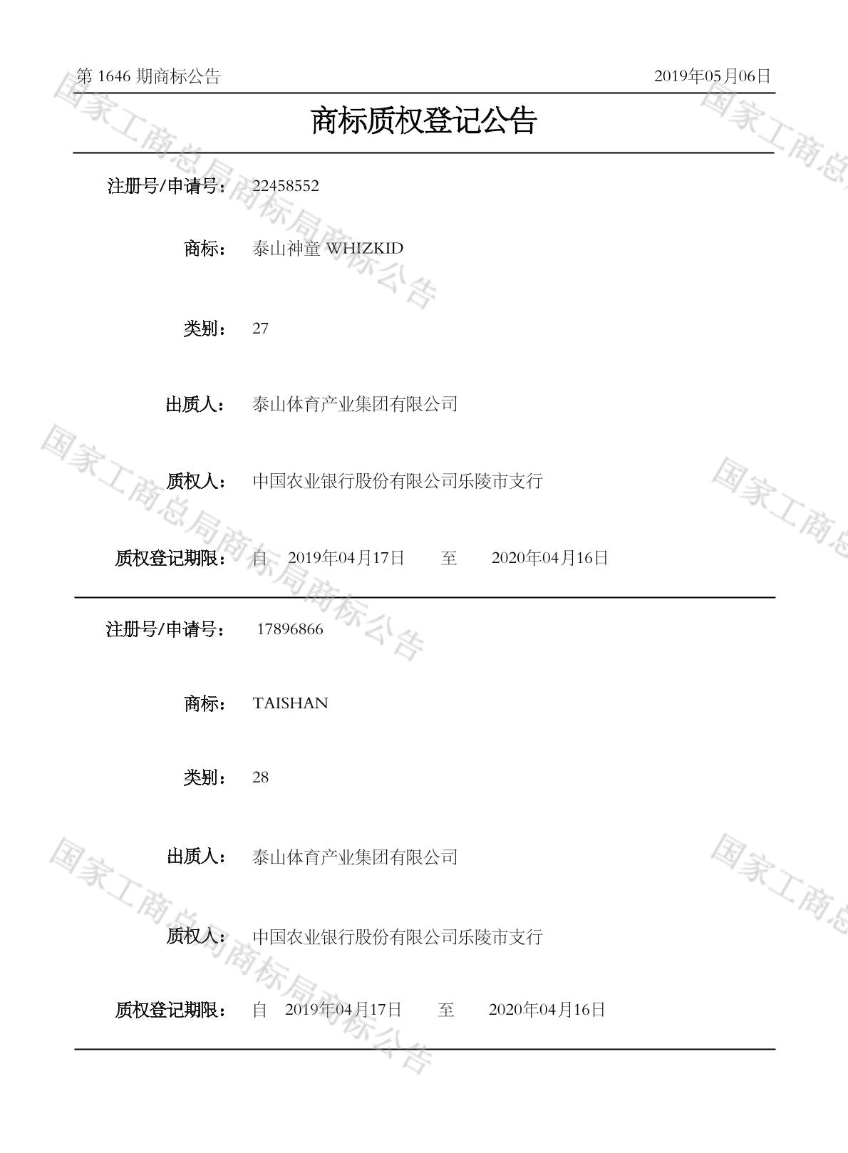 商标质权登记公告 2019-05-06 第1646期 查看公告