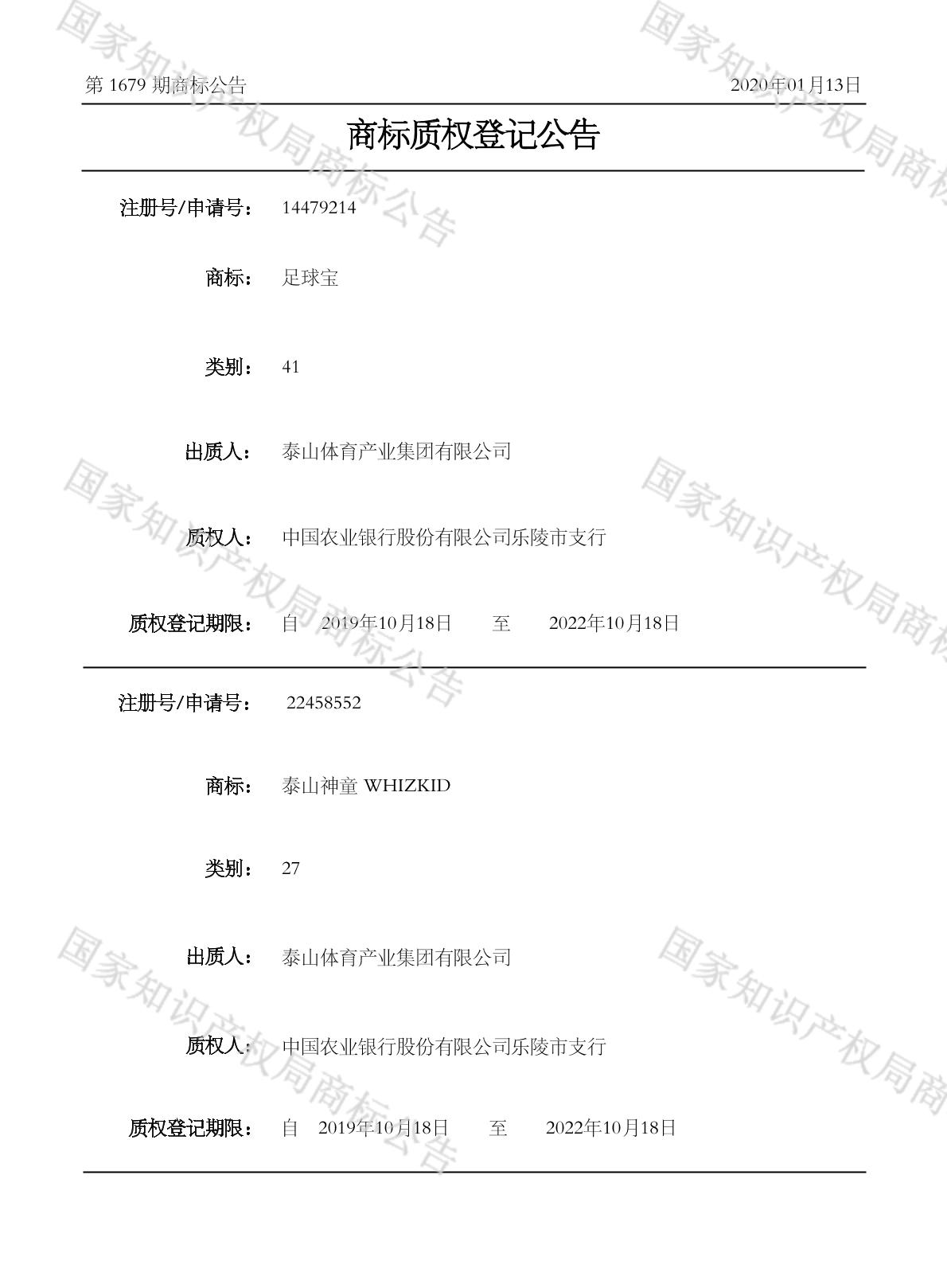 商标质权登记公告 2020-01-13 第1679期 查看公告
