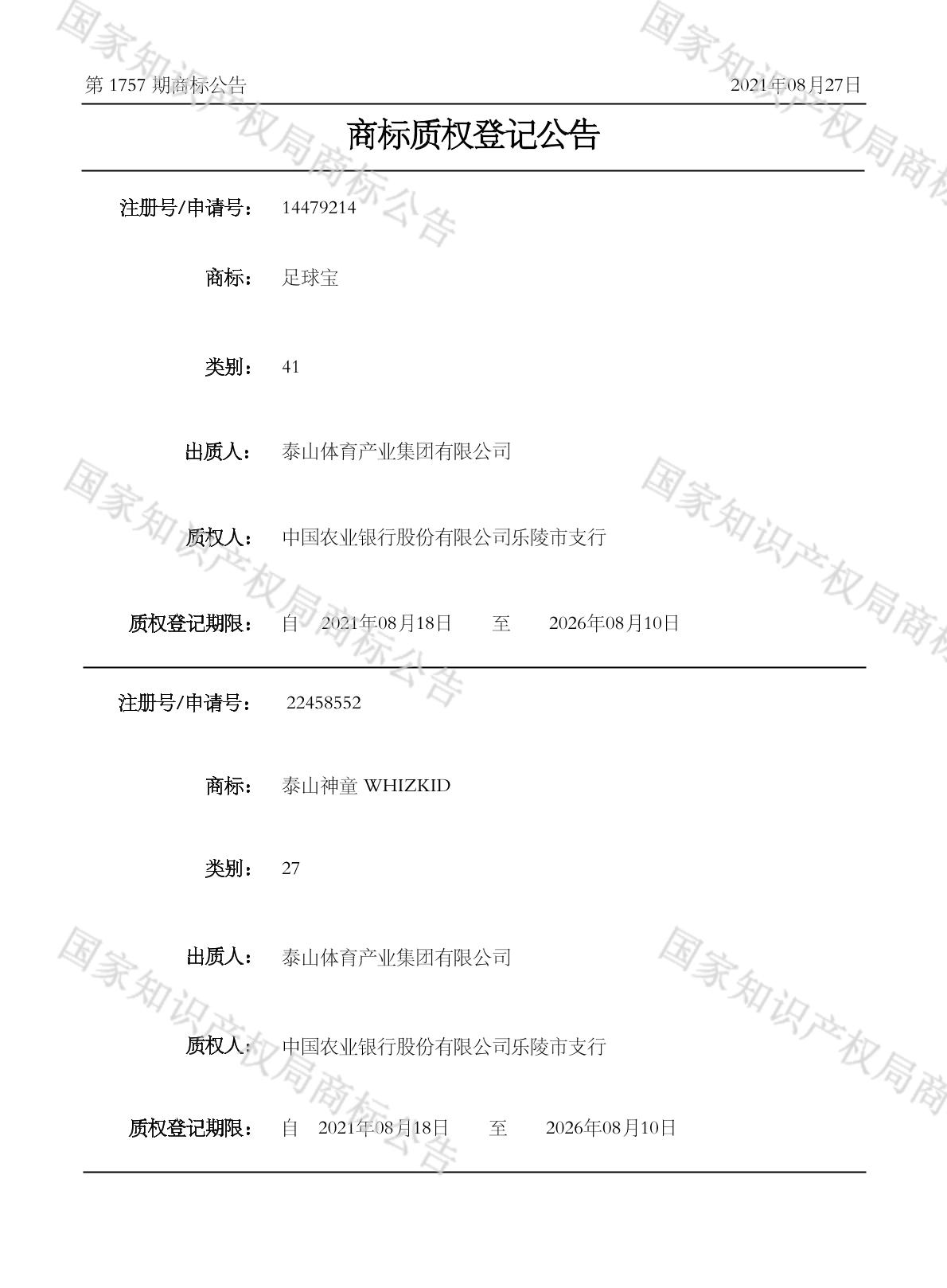 商标质权登记公告 2021-08-27 第1757期 查看公告
