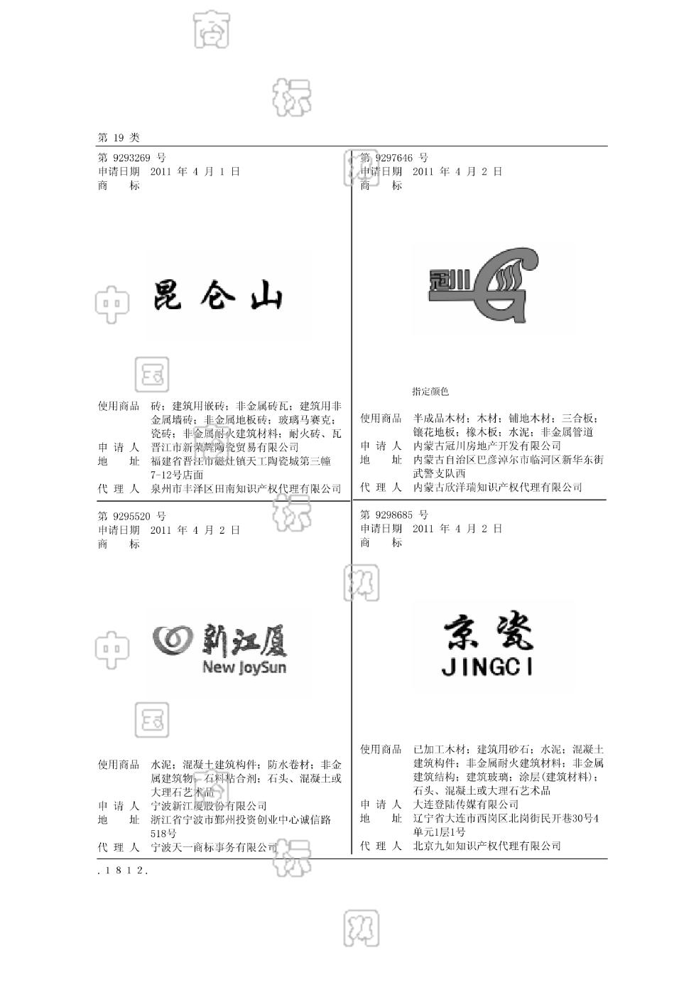 1904-水泥;1906-建筑用嵌砖;1906-建筑用非金属墙砖;1906-玻璃马赛克;1906-瓷砖;1906-砖;1906-非金属地板砖;1906-非金属砖瓦;1907-耐火砖、瓦;1907-非金属耐火建筑材料 - 1299