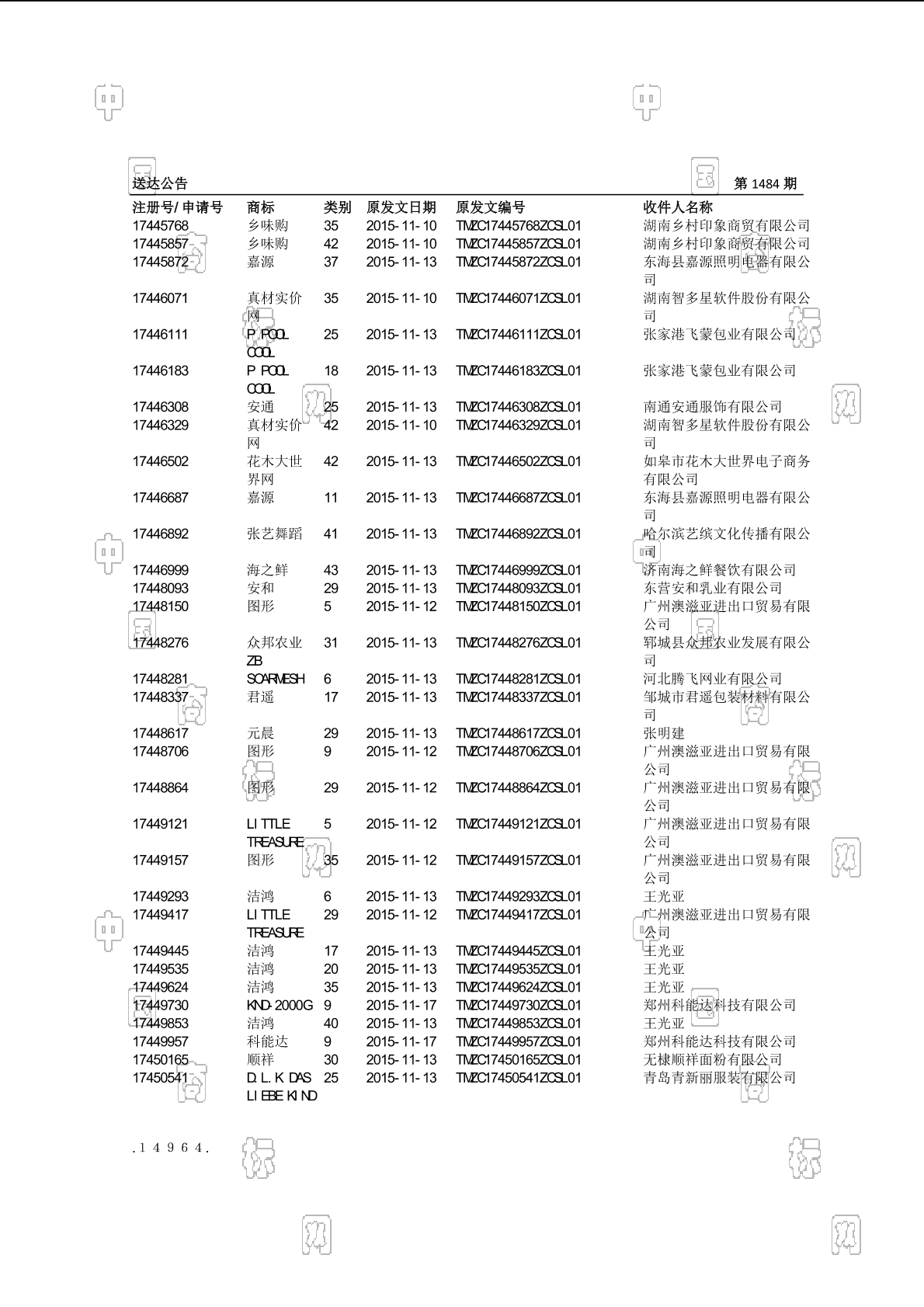 2015-12-23 商标注册申请 | 排版送达公告(商标注册申请受理通知书)