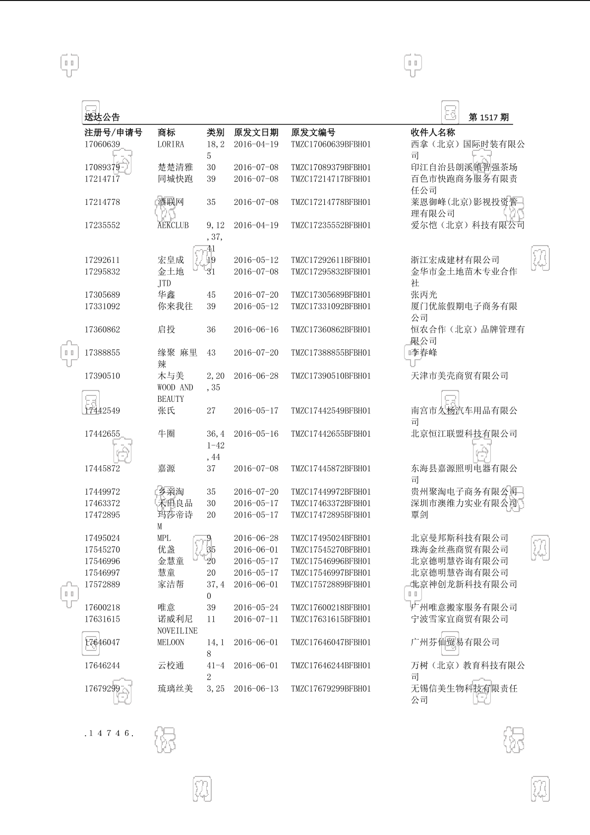 2017-05-15 商标注册申请 | 领退信管理(商标注册证)