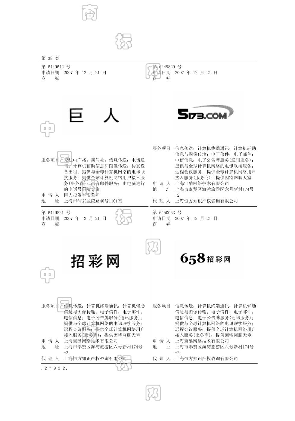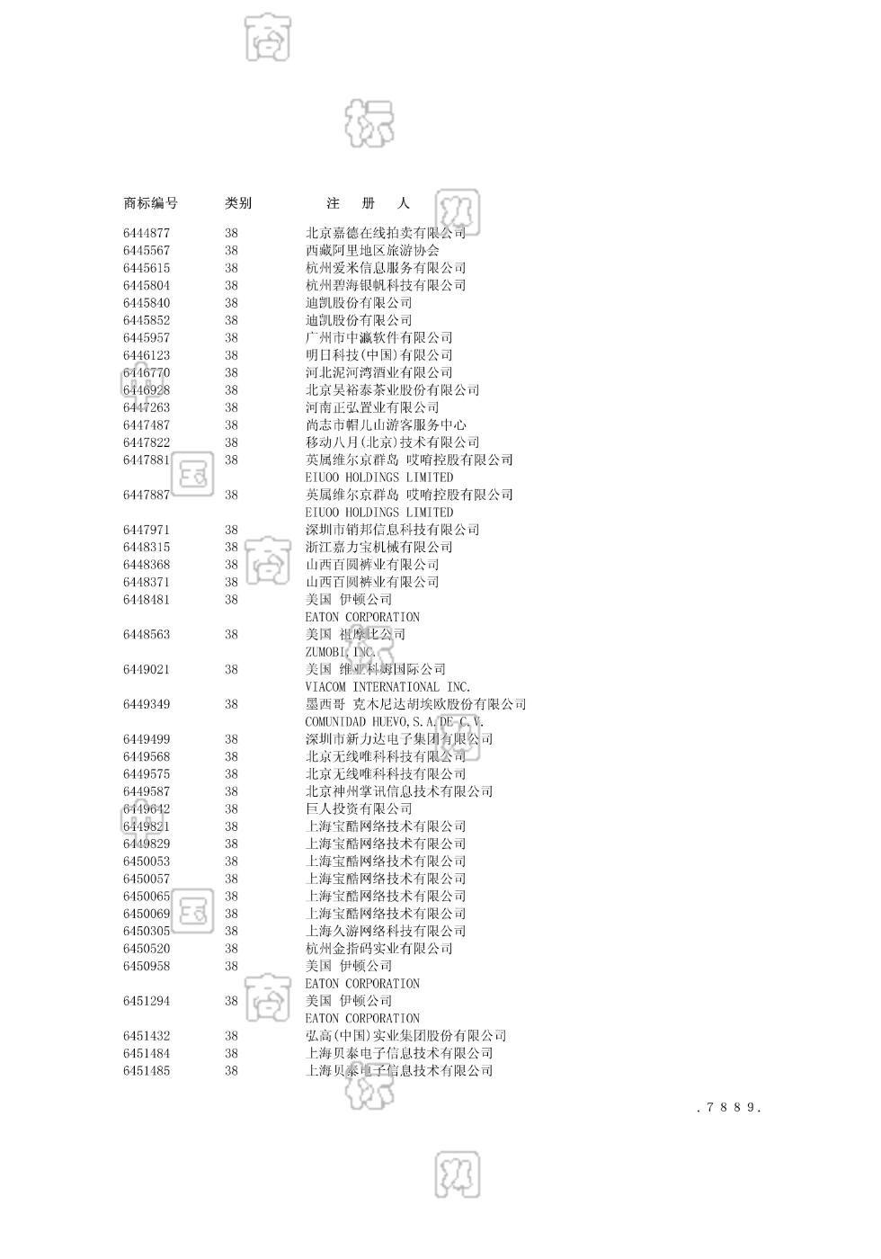 3801-新闻社;3801-无线电广播;3802-传真设备出租;3802-信息传送;3802-提供与全球计算机网络的电讯联接服务;3802-提供全球计算机网络用户接入服务(服务商);3802-由电脑进行的电话号码簿查询;3802-电话通讯;3802-计算机辅助信息和图像传送;3802-语音邮件服务 - 1197