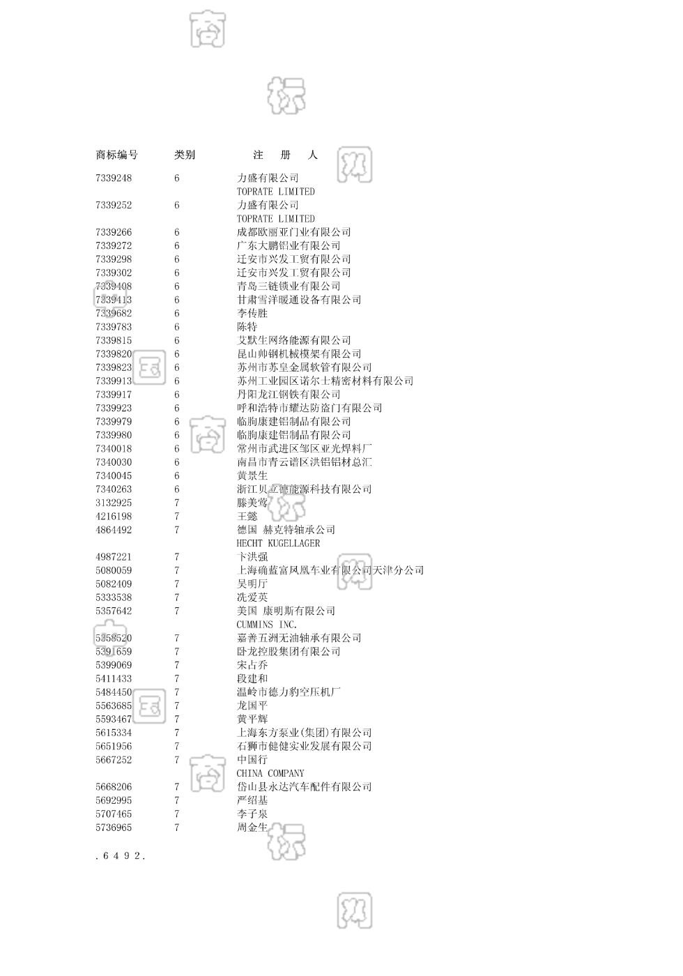 0704-造纸机;0724-洗衣机;0735-压力机;0739-水力发电机和马达;0741-拉链机;0744-静电工业设备;0750-万向节;0750-分离器;0750-滑轮;0750-轴承(机器零件) - 1215
