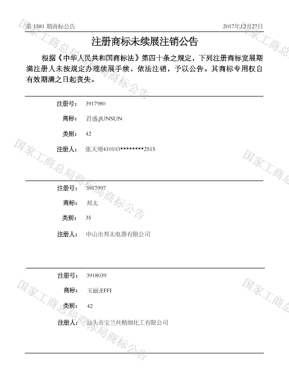 2017-12-27 期满未续展注销商标 | 排版未续展注销公告
