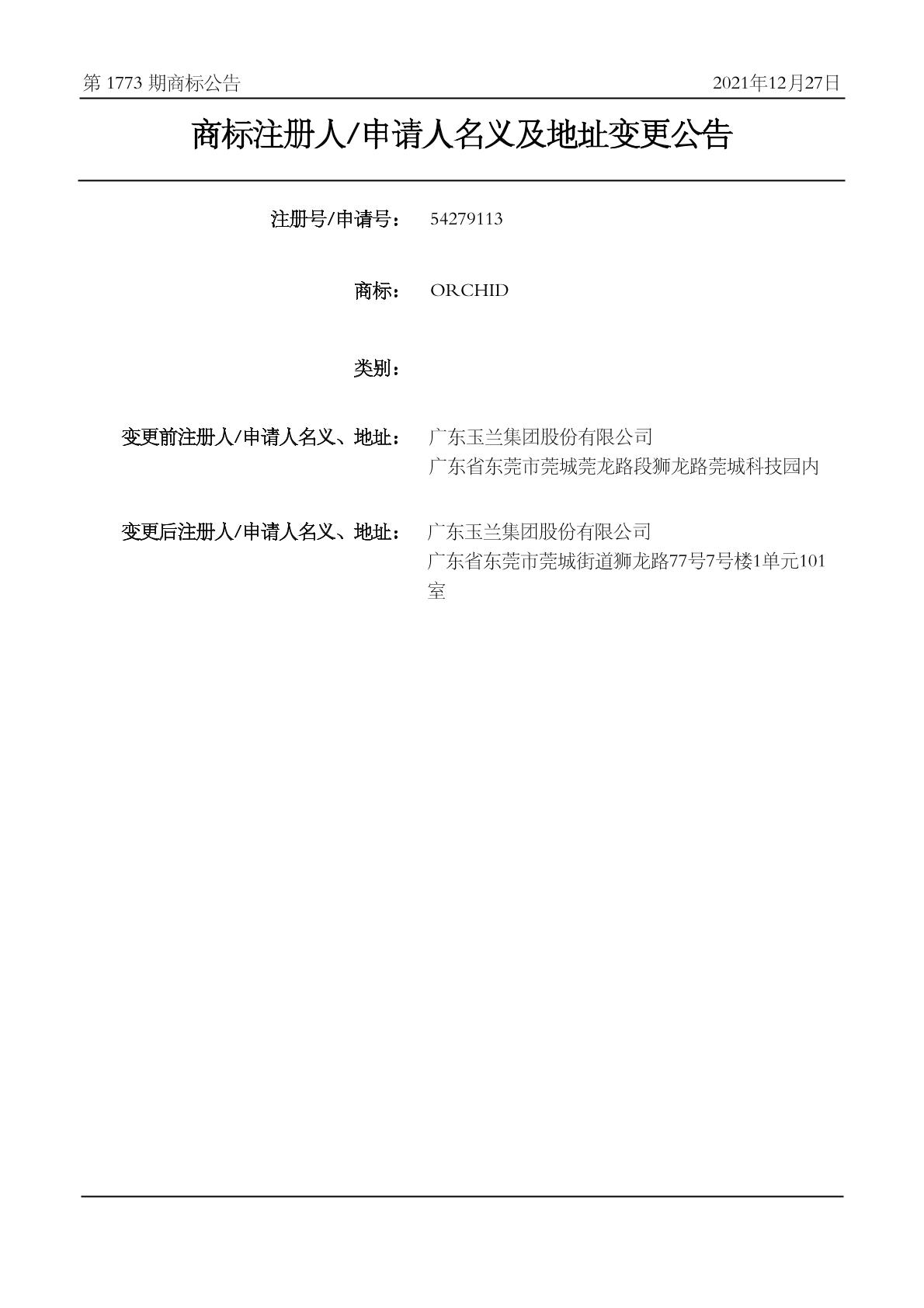 商标注册人/申请人名义及地址变更公告 2021-12-27 第1773期 查看公告