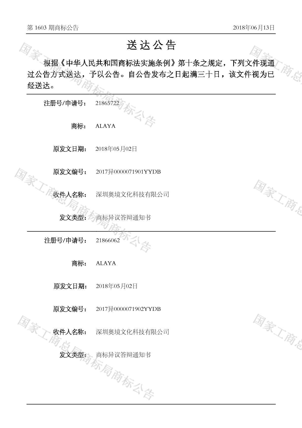 2018-06-13 商标异议申请 | 排版送达公告(商标异议答辩通知书)