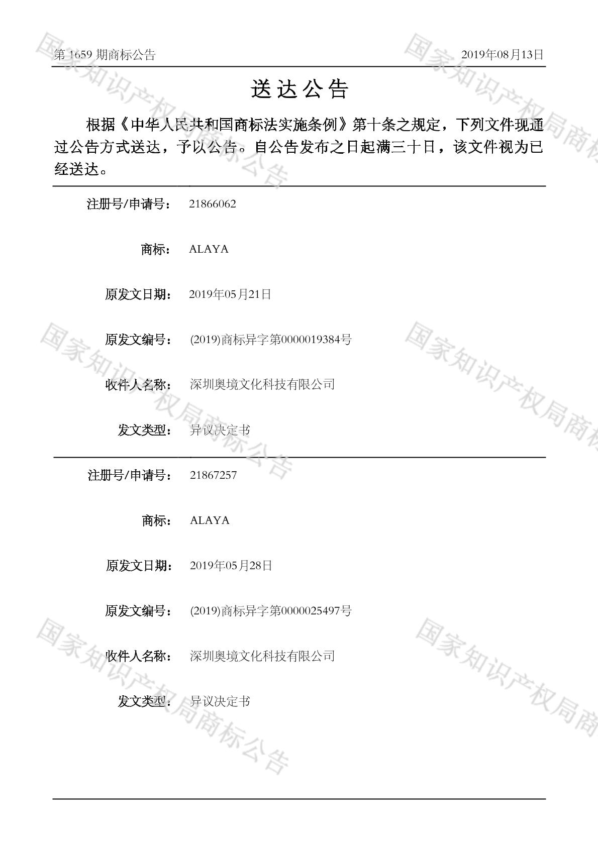 2019-09-21 商标异议申请 | 排版送达公告(异议决定书)