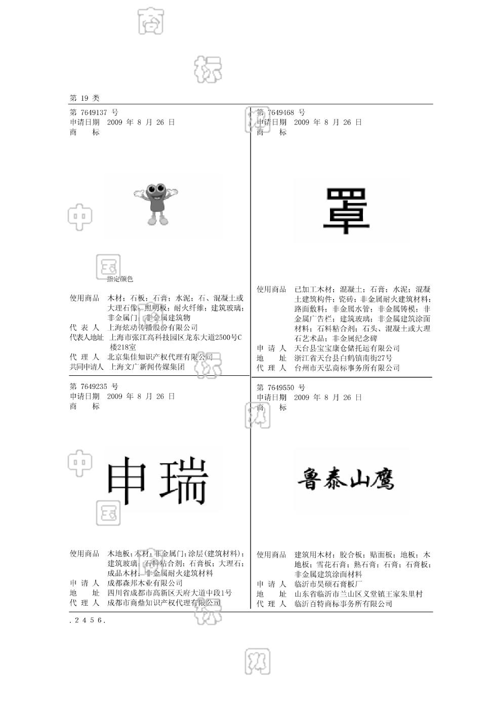 1901-已加工木材;1902-混凝土;1903-石膏;1904-水泥;1905-混凝土建筑构件;1906-瓷砖;1907-非金属耐火建筑材料;1908-路面敷料;1909-非金属水管;1909-非金属铸模;1910-非金属广告栏;1911-建筑玻璃;1912-非金属建筑涂面材料;1913-石料粘合剂;1914-石头、混凝土或大理石艺术品;1915-非金属纪念碑 - 1227