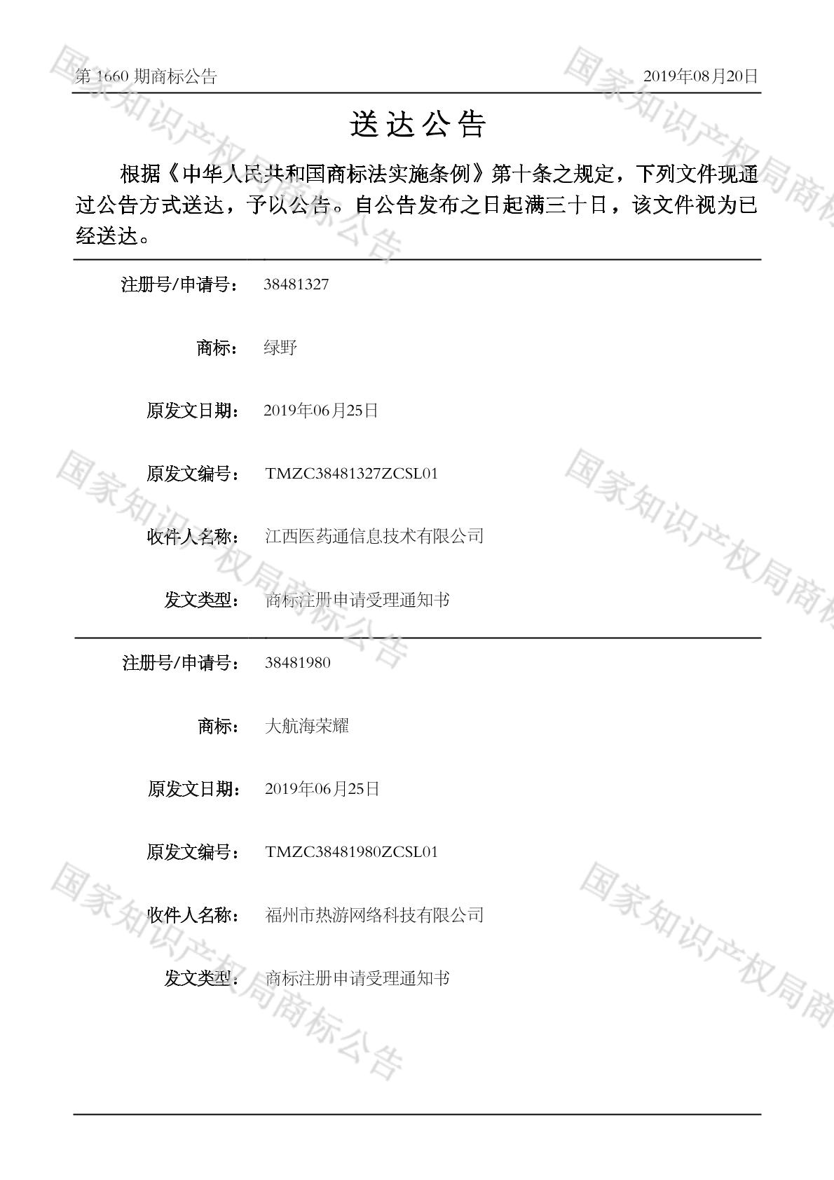 2019-08-20 商标注册申请 | 排版送达公告(商标注册申请受理通知书)