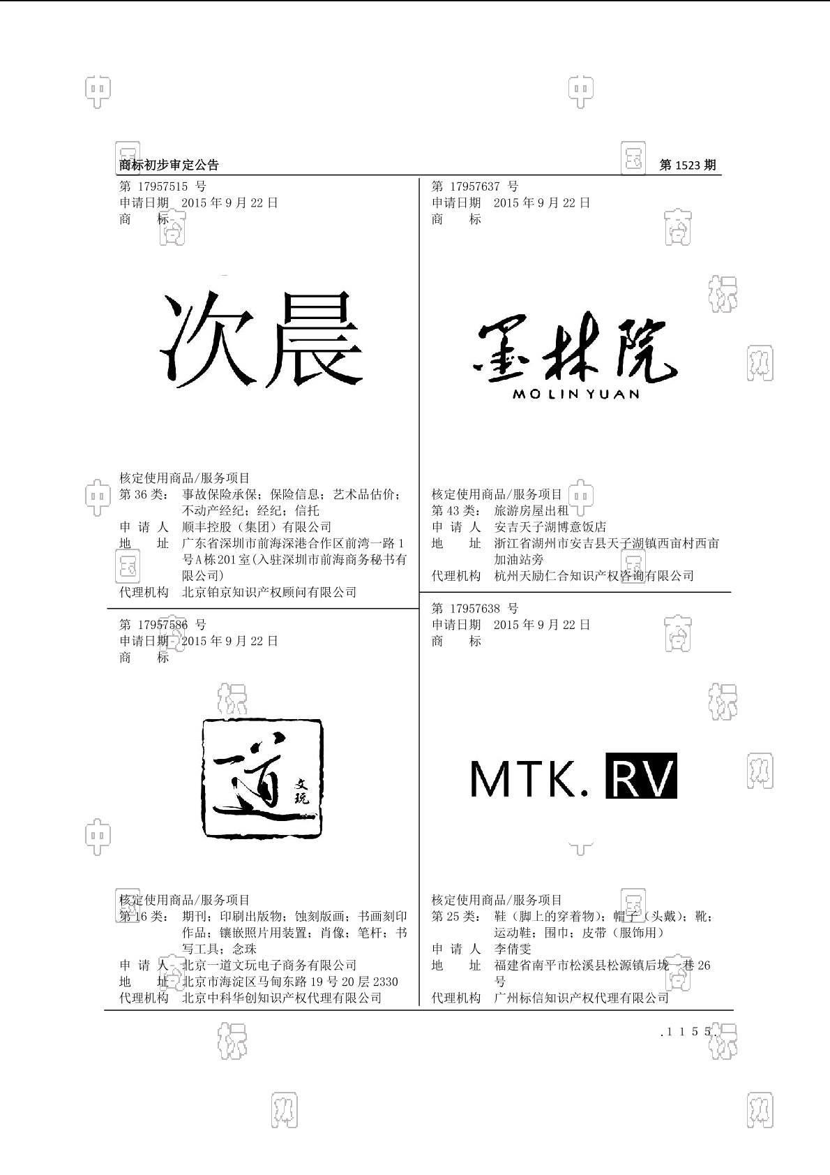 1606-印刷出版物;1606-期刊;1607-书画刻印作品;1607-肖像;1607-蚀刻版画;1607-镶嵌照片用装置;1611-转盘笔挂;1614-书写工具;1614-笔杆;1621-念珠 - 1523