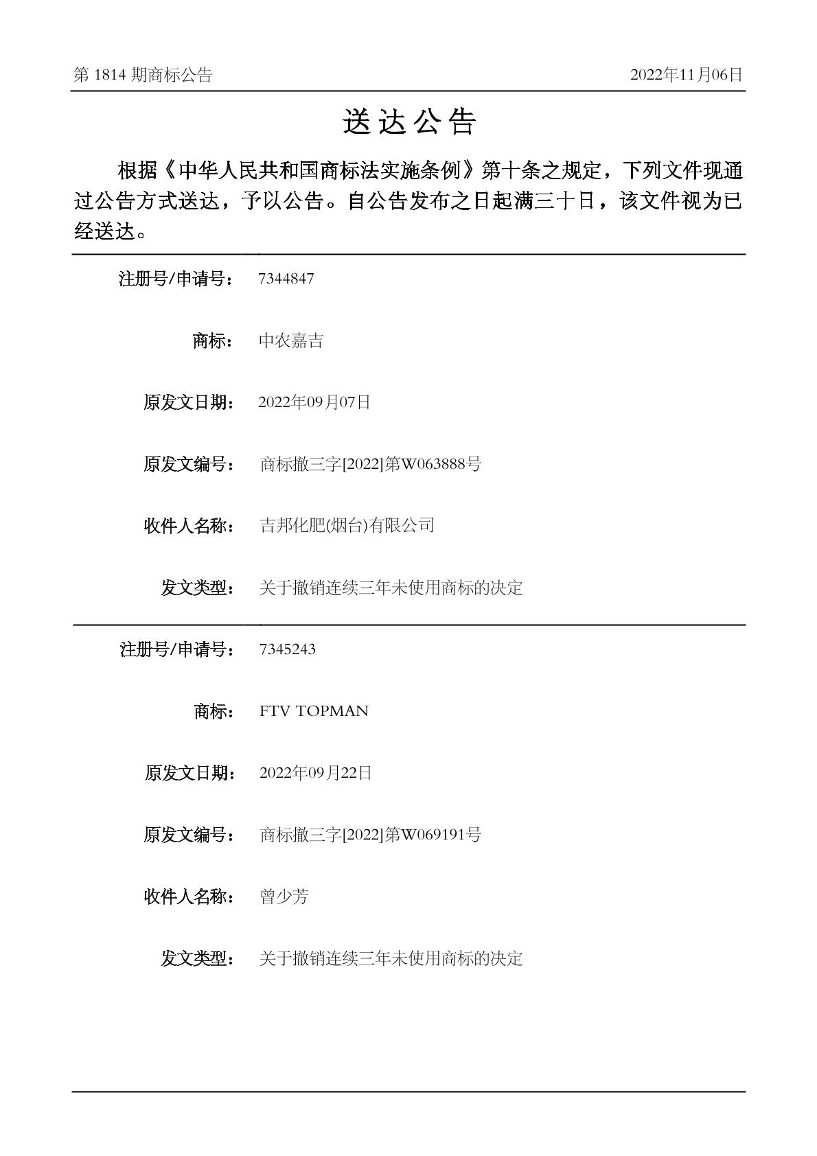 2022-11-07 撤销连续三年停止使用注册商标 | 排版送达公告(关于撤销连续三年未使用商标的决定)