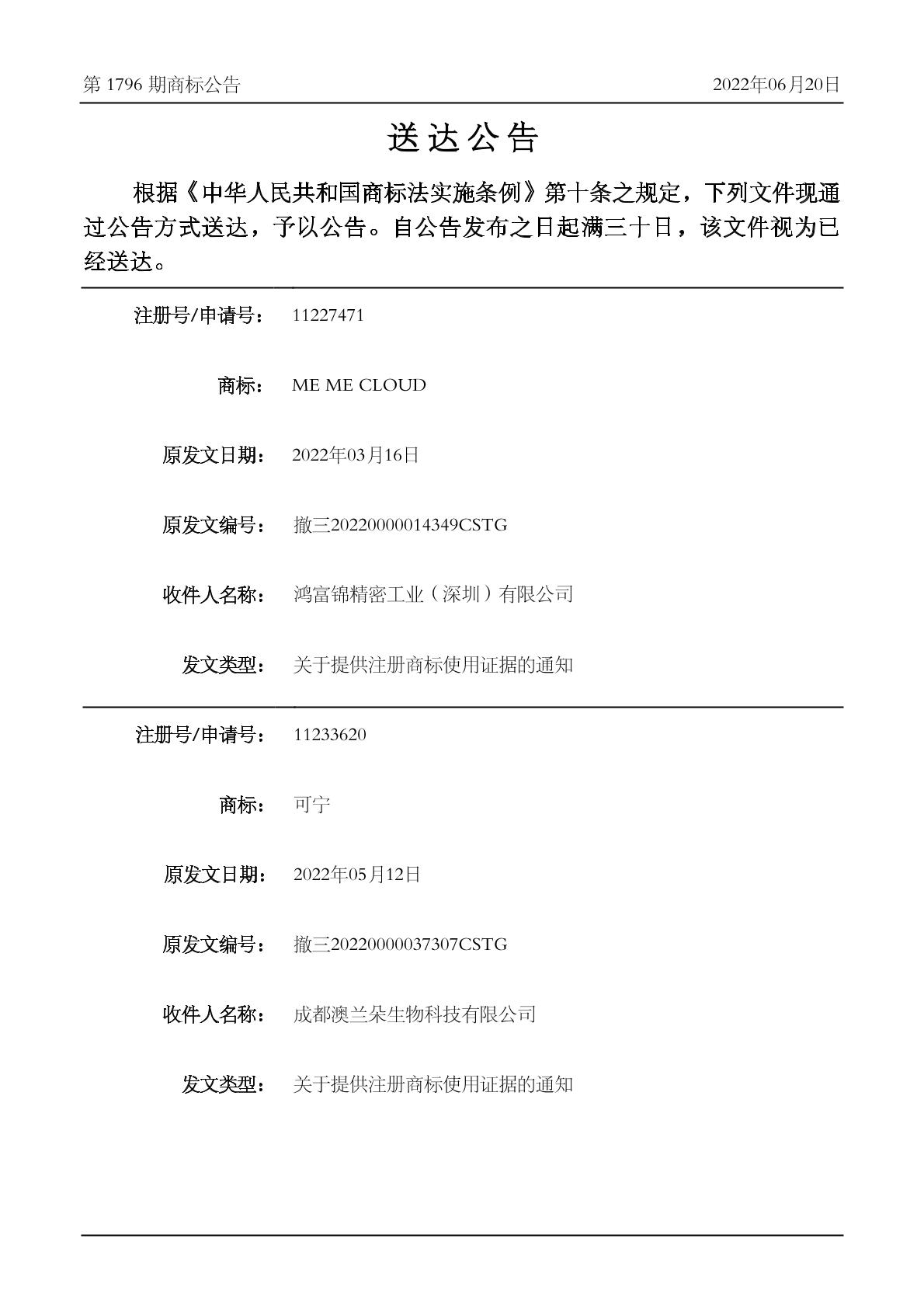 2022-06-20 撤销连续三年停止使用注册商标 | 排版送达公告(关于提供注册商标使用证据的通知)