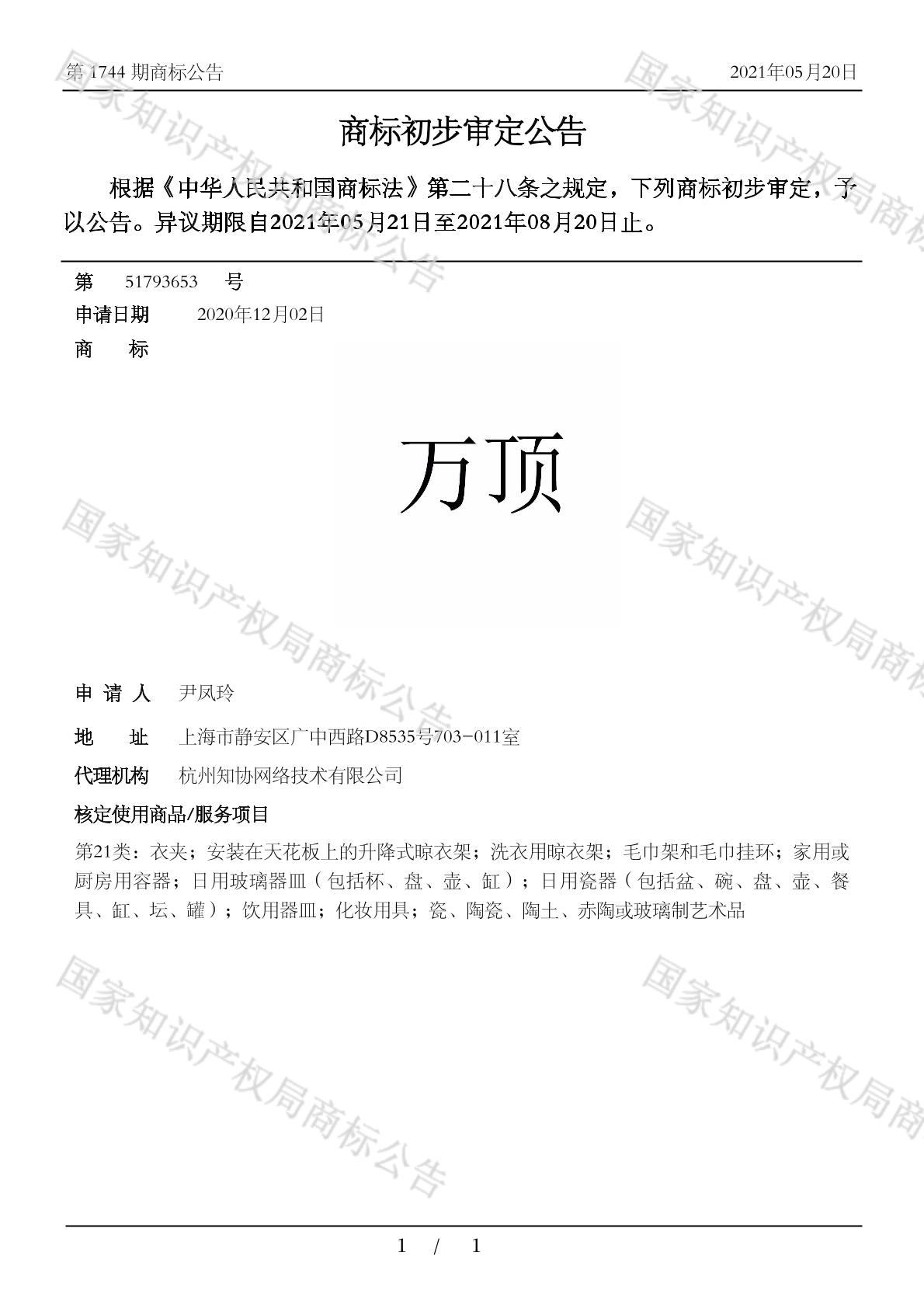 2101-家用或厨房用容器;2102-日用玻璃器皿(包括杯、盘、壶、缸);2103-日用瓷器(包括盆、碗、盘、壶、餐具、缸、坛、罐);2104-瓷、陶瓷、陶土、赤陶或玻璃制艺术品;2105-饮用器皿;2106-安装在天花板上的升降式晾衣架;2106-毛巾架和毛巾挂环;2106-洗衣用晾衣架;2106-衣夹;2110-化妆用具 - 1744
